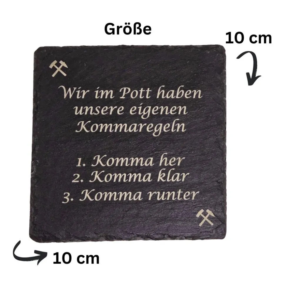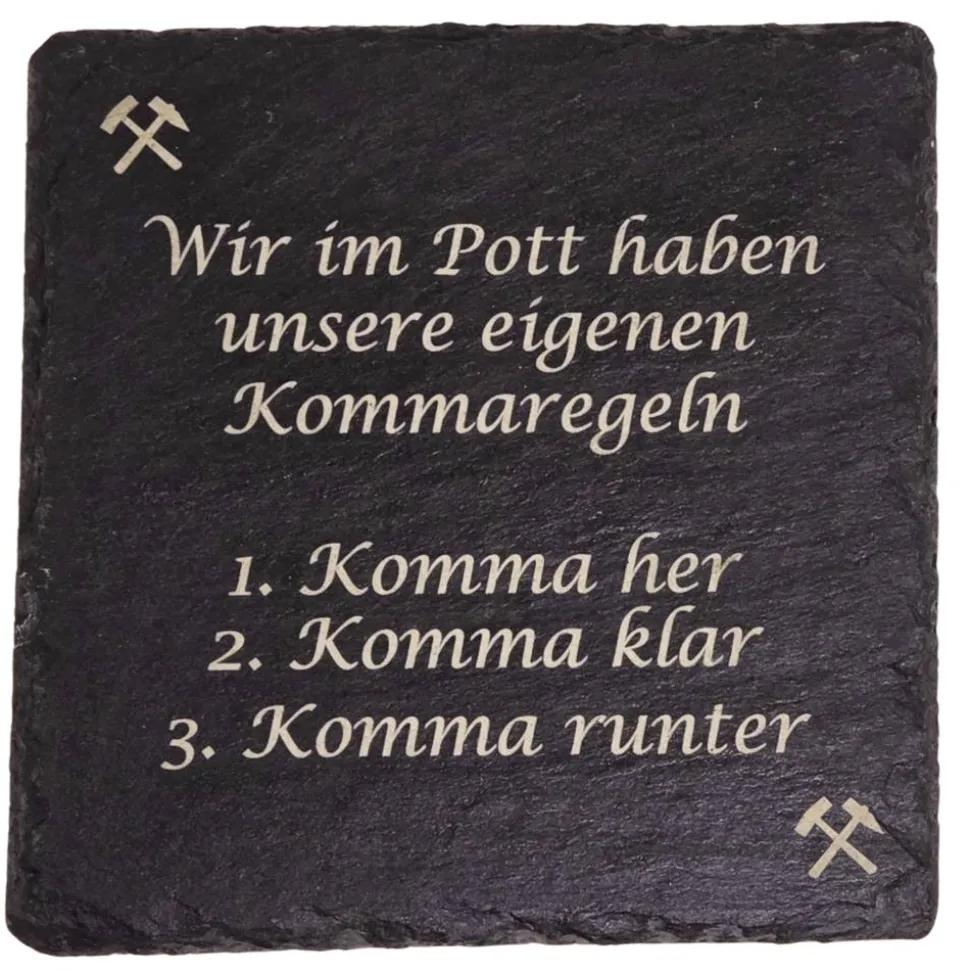 Entdecke einzigartige RuhrPott Untersetzer aus Schiefer und bring echtes Revier-Feeling auf deinen Tisch! Diese hochwertigen Untersetzer sind mit moderner Lasergravur versehen und zeigen klassische RuhrPott-Motive wie Kommaregeln, Förderturm, Zollverein und Prosper Haniel. Perfekt als Geschenk für RuhrPott-Freunde, Kumpel oder als Andenken an deine Heimat.
