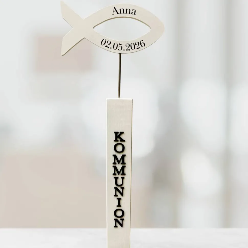 Dieser liebevoll handgefertigte Kommunionsaufsteller mit Fischsymbol ist eine ganz besondere Dekoration für die erste heilige Kommunion und ein wunderschönes Erinnerungsstück.