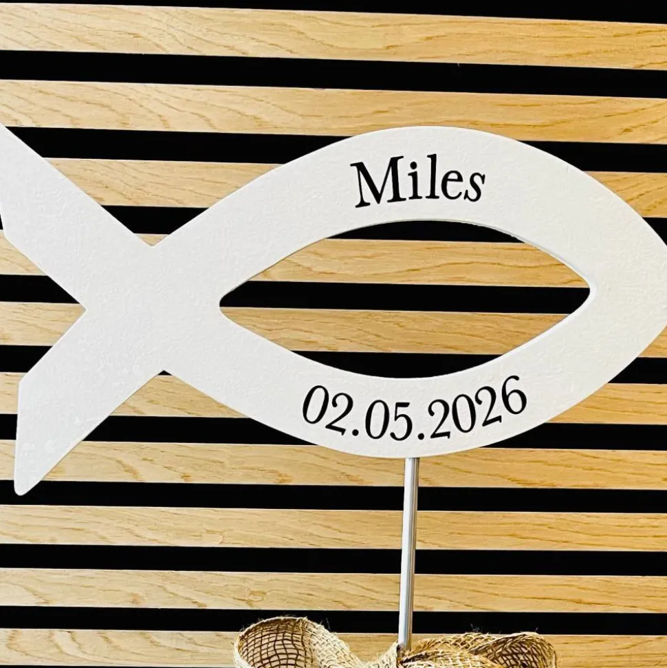 Der Aufsteller wird weiß lackiert und mit dem gewählten Schriftzug versehen. Das Highlight: Der Fisch kann ganz individuell mit Name und Datum personalisiert werden – perfekt als persönliches Geschenk von Eltern, Paten oder Großeltern.