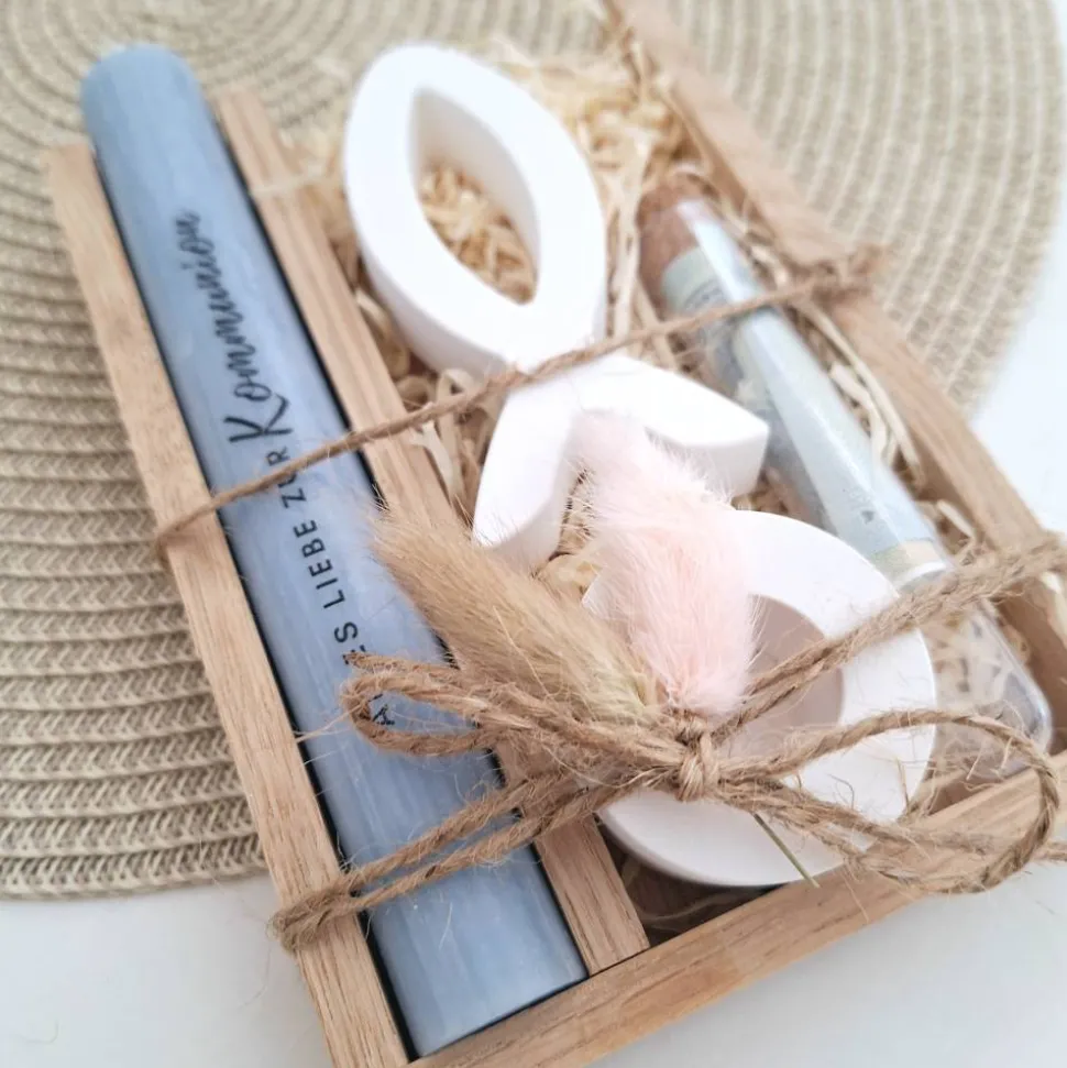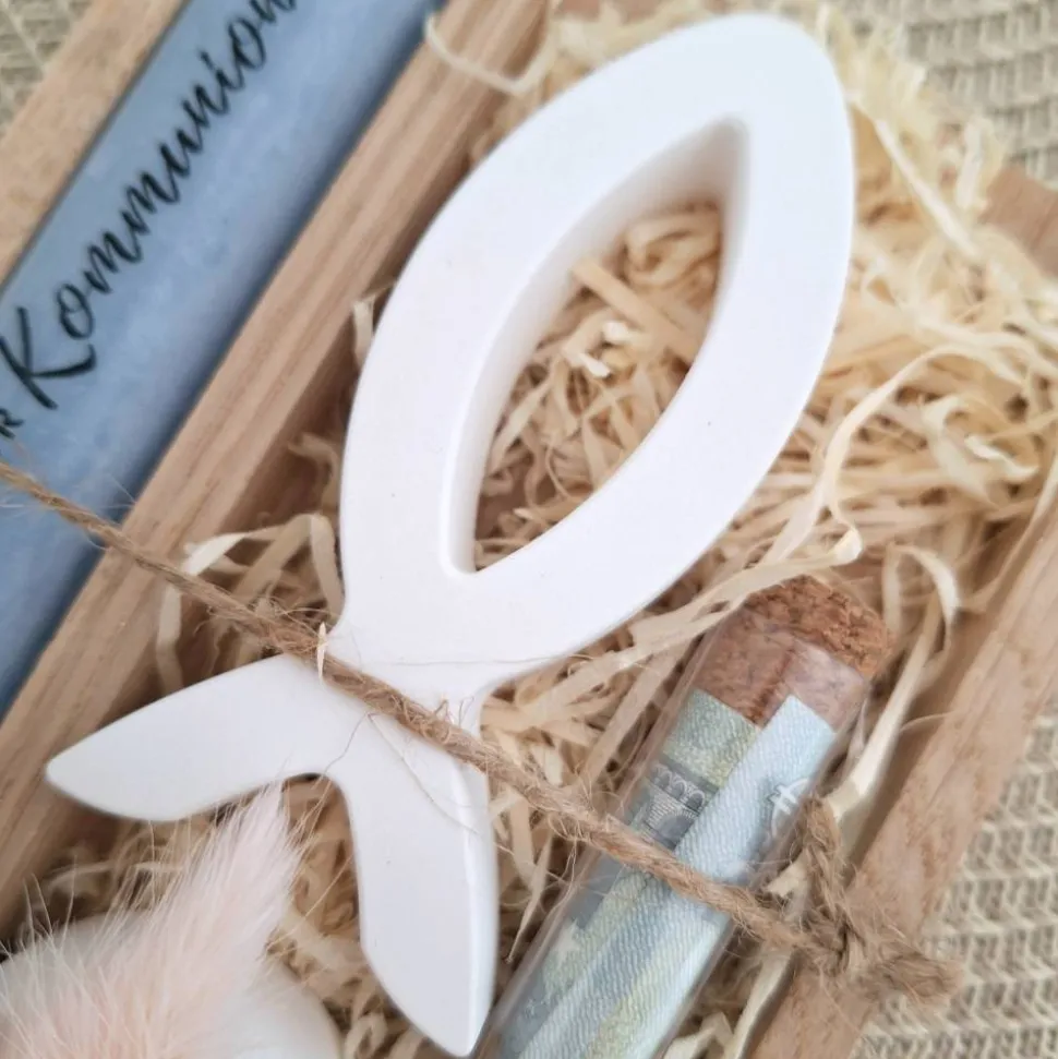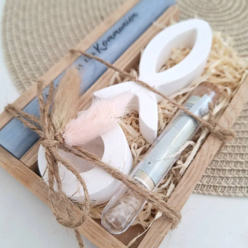 Ergänzt wird das Set mit einem Reagenzglas worin man dem Kommunionskind Geld, Gutscheine oder Ähnliches übergeben kann.