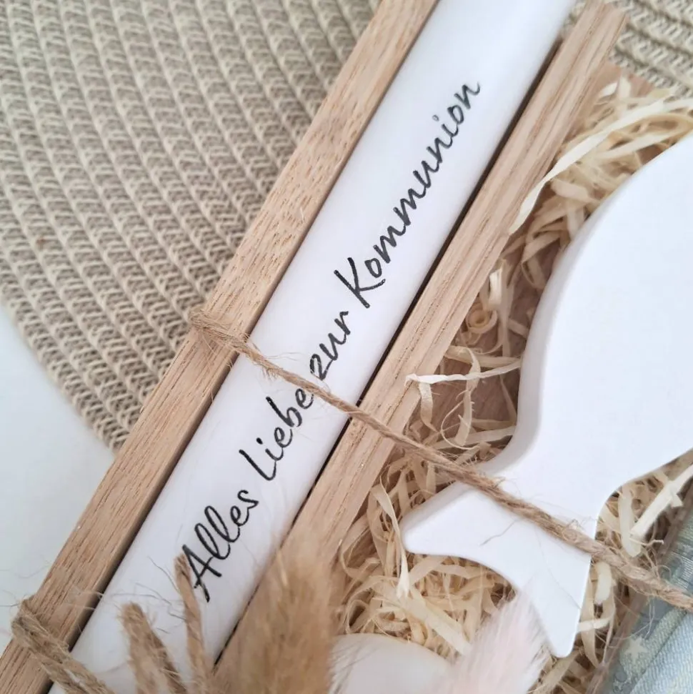 Ergänzt wird das Set mit einem Reagenzglas worin man dem Kommunionskind Geld, Gutscheine oder Ähnliches übergeben kann.