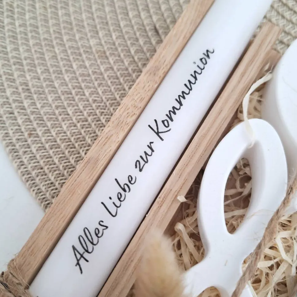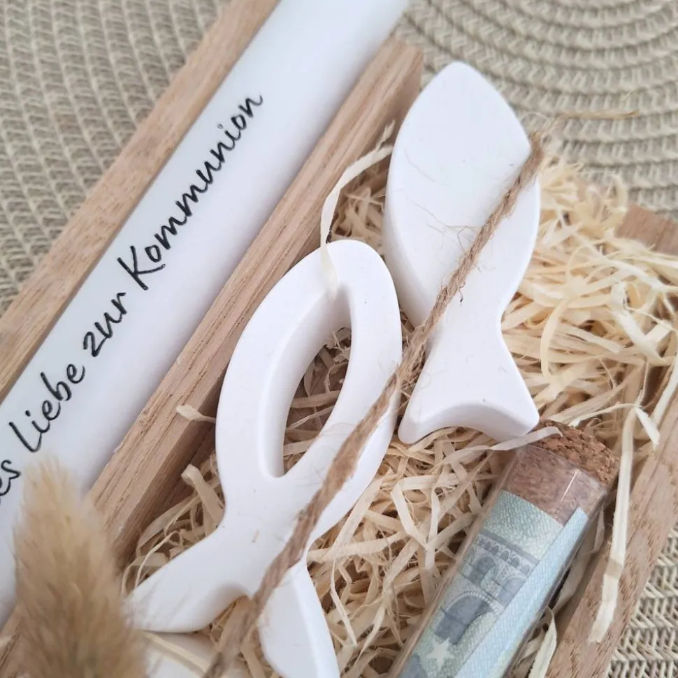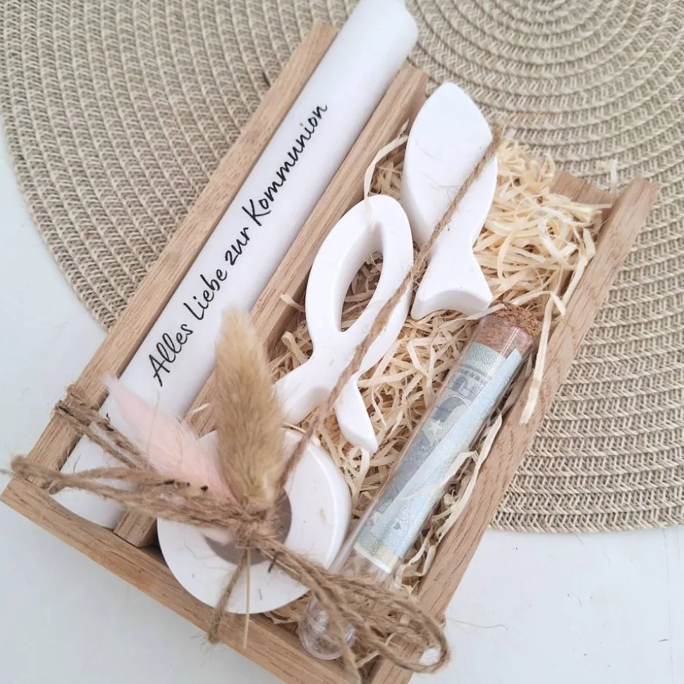 Ergänzt wird das Set mit einem Reagenzglas worin man dem Kommunionskind Geld, Gutscheine oder Ähnliches übergeben kann.