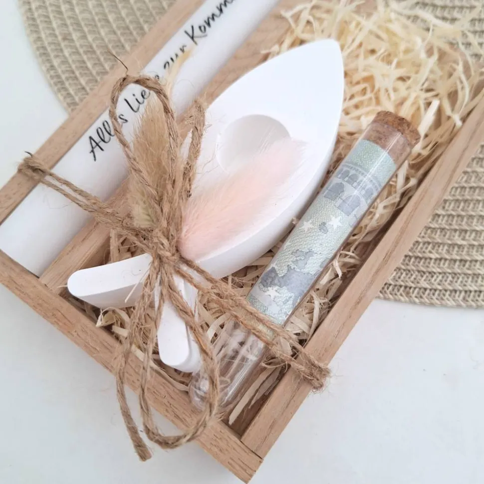 Das Set wird in einem Holzrahmen mit Trockenblumen zusammengebunden und kann so direkt verschenkt werden.