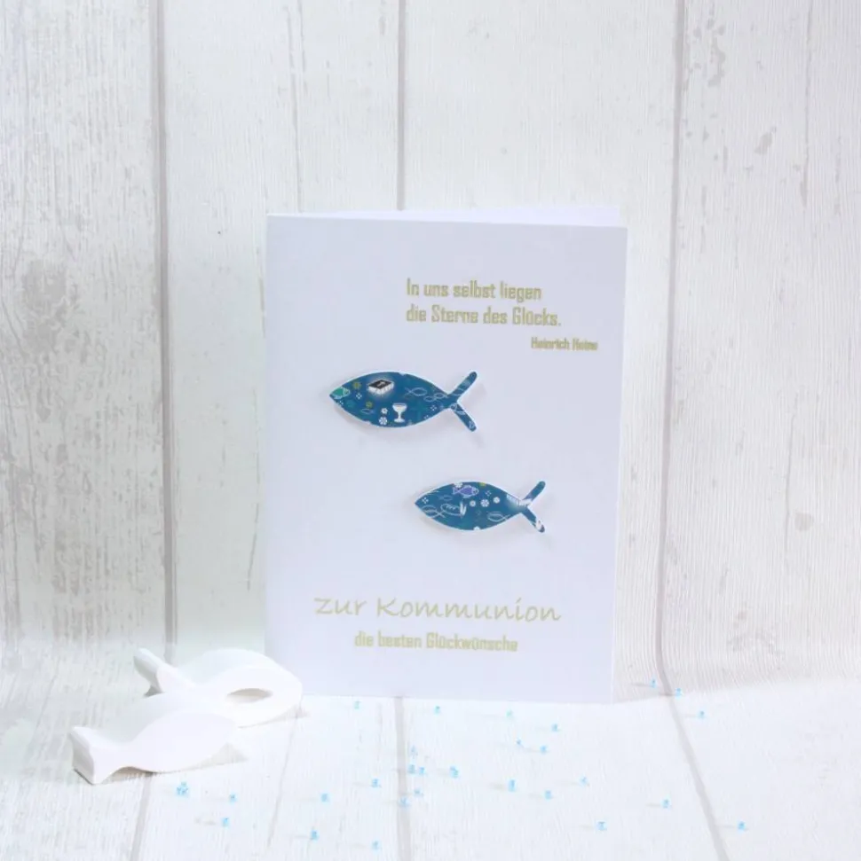 Hier ist eine von mir liebevoll, handgefertigte Klappkarte aus hochwertigem Tonkarton. Die Fische wurden auf die Karte geklebt. Die Aufschrift wurde mit Goldstift auf der Karte aufgetragen.