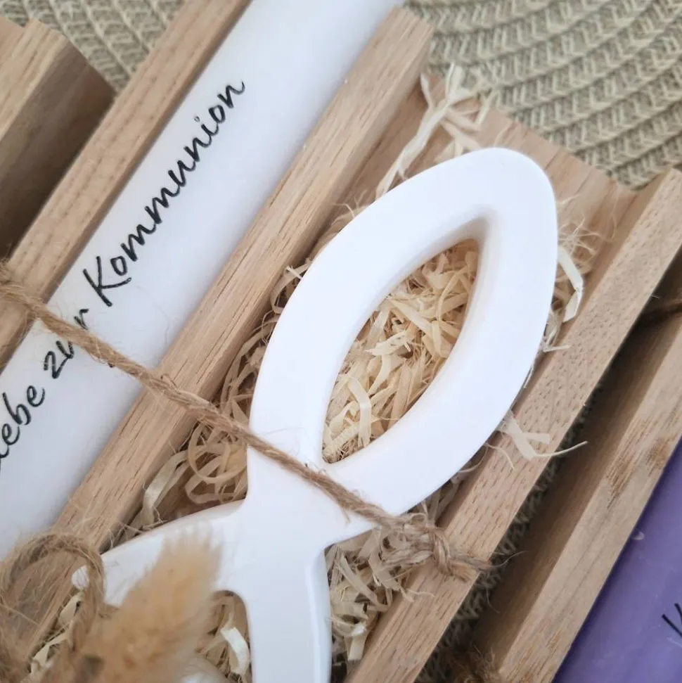 Das Kerzenset besteht aus einer Kerze (in der Farbe deiner Wahl) mit einer Aufschrift deiner Wahl, einem passenden Kerzenhalter in runder Form und einem Fisch (Variante 1).