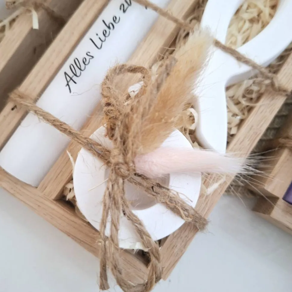 Das Set wird in einem Holzrahmen mit Trockenblumen zusammengebunden und kann so direkt verschenkt werden.
