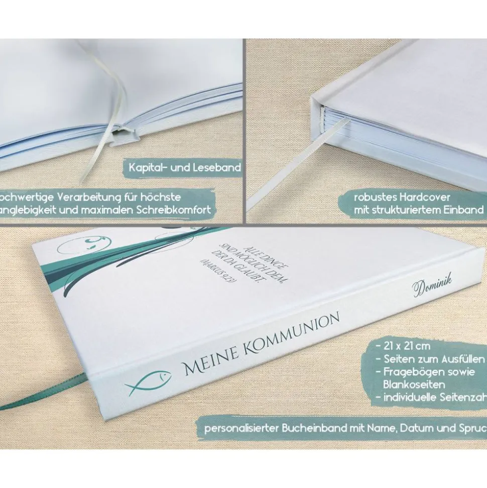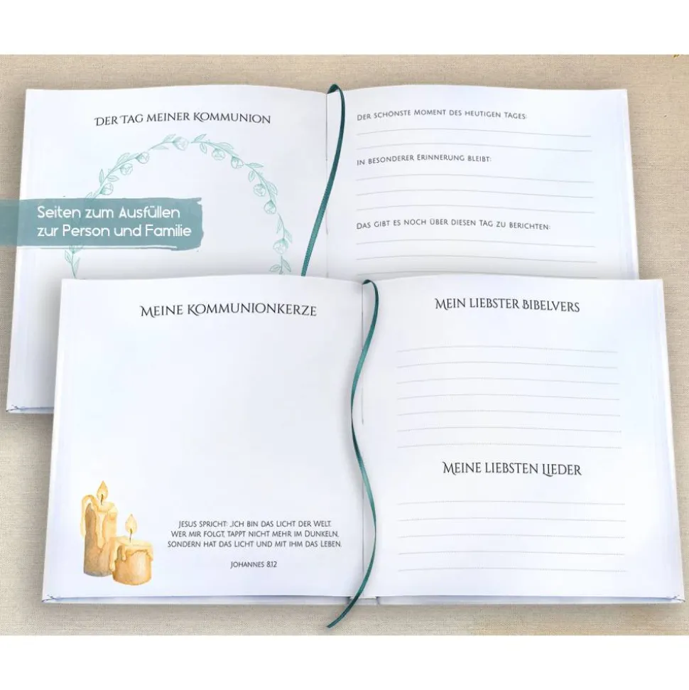Das personalisierte Kommunionbuch wird mit viel Liebe und Sorgfalt in reiner Handarbeit für euch gefertigt. Das Kommunionalbum kann als Blankobuch mit leeren Seiten oder mit Fragen zum Ausfüllen angefertigt werden. Beide Varianten bieten euch und euren Gästen viel Platz für eigene Worte und viele Fotos.