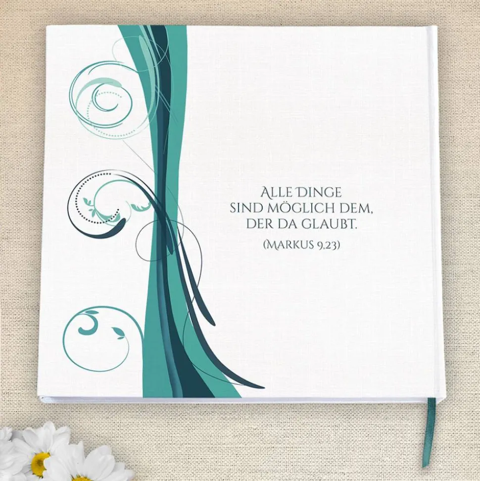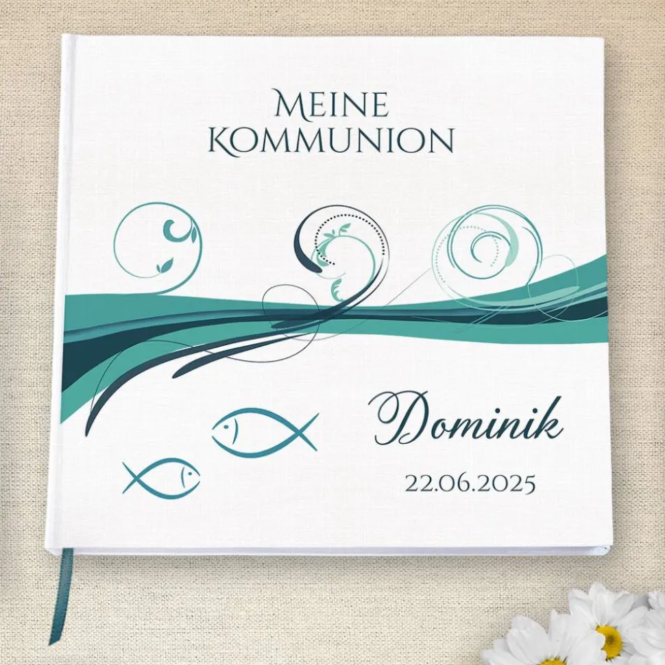 Das maritime Gästebuch zur Kommunion wird mit dem christlichen Motiv der Fische in Wellen in leuchtendem Türkis gestaltet.