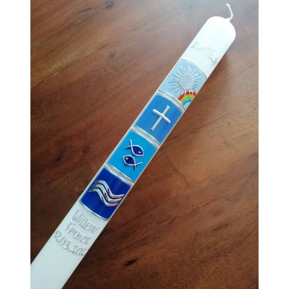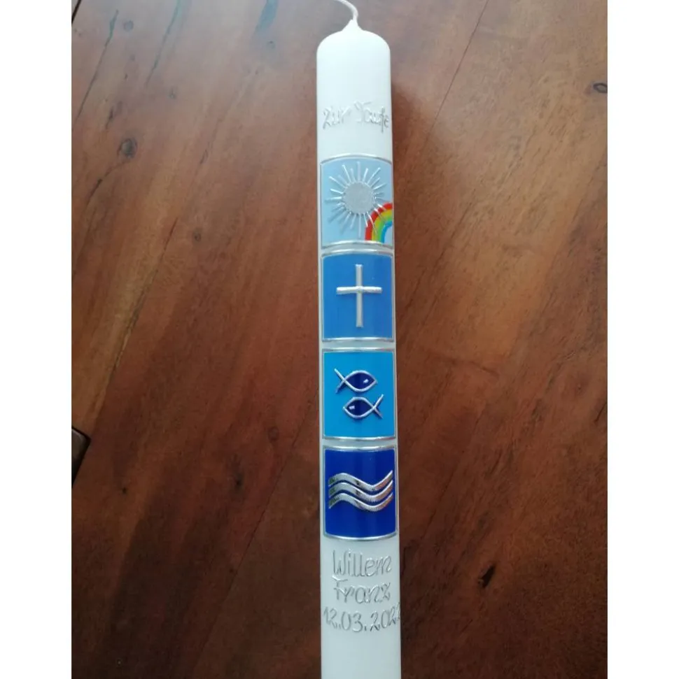Die Taufkerze kann Ihren Wünschen entsprechend beschriftet werden.