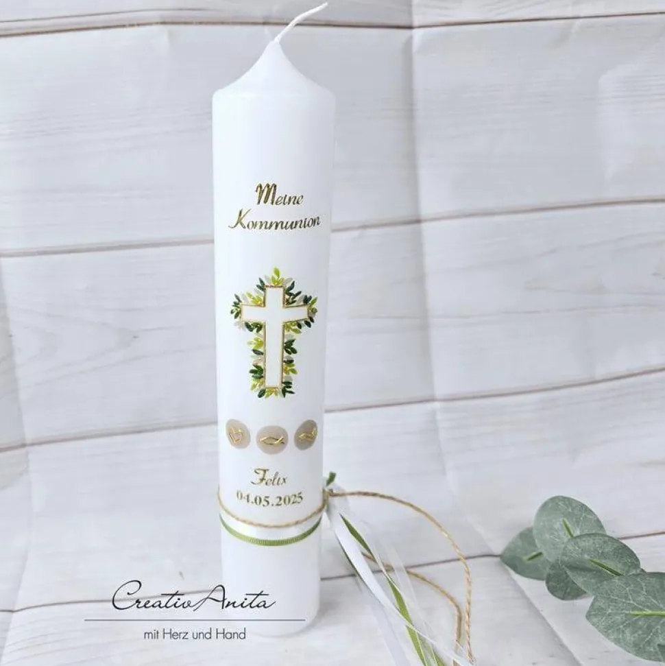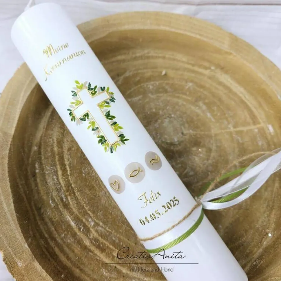 Die Schriftzüge „Meine Kommunion“, Name und Datum werden mit Vinylschrift in gold aufgebracht.
