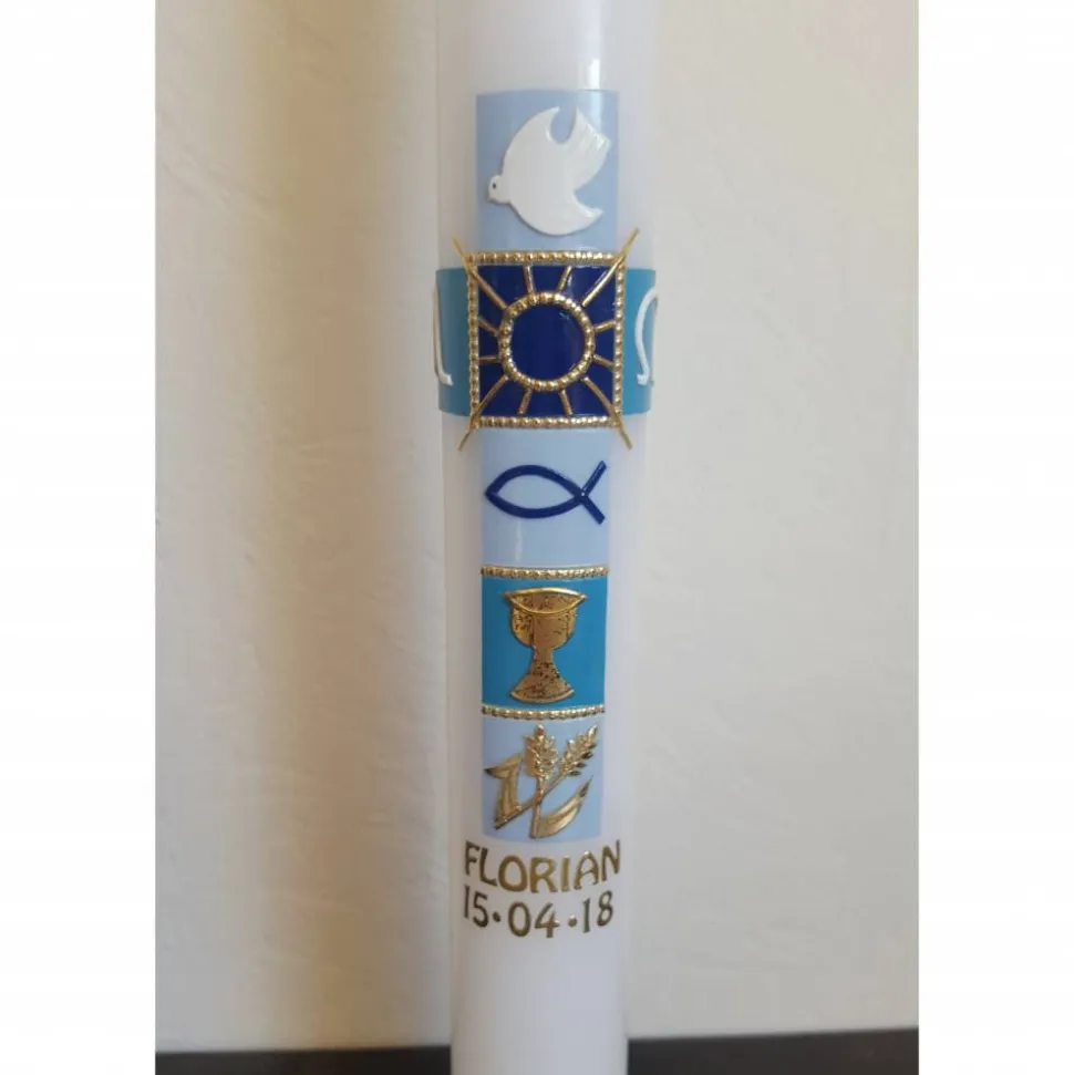 Auf den blauen Kästchen finden sich verschiedene Symbole, wie Kelch oder Ähre, passend zur Erstkommunion. Das Motiv wird komplett aus Wachs gefertigt, für Name und Datum verwenden wir Konturensticker.