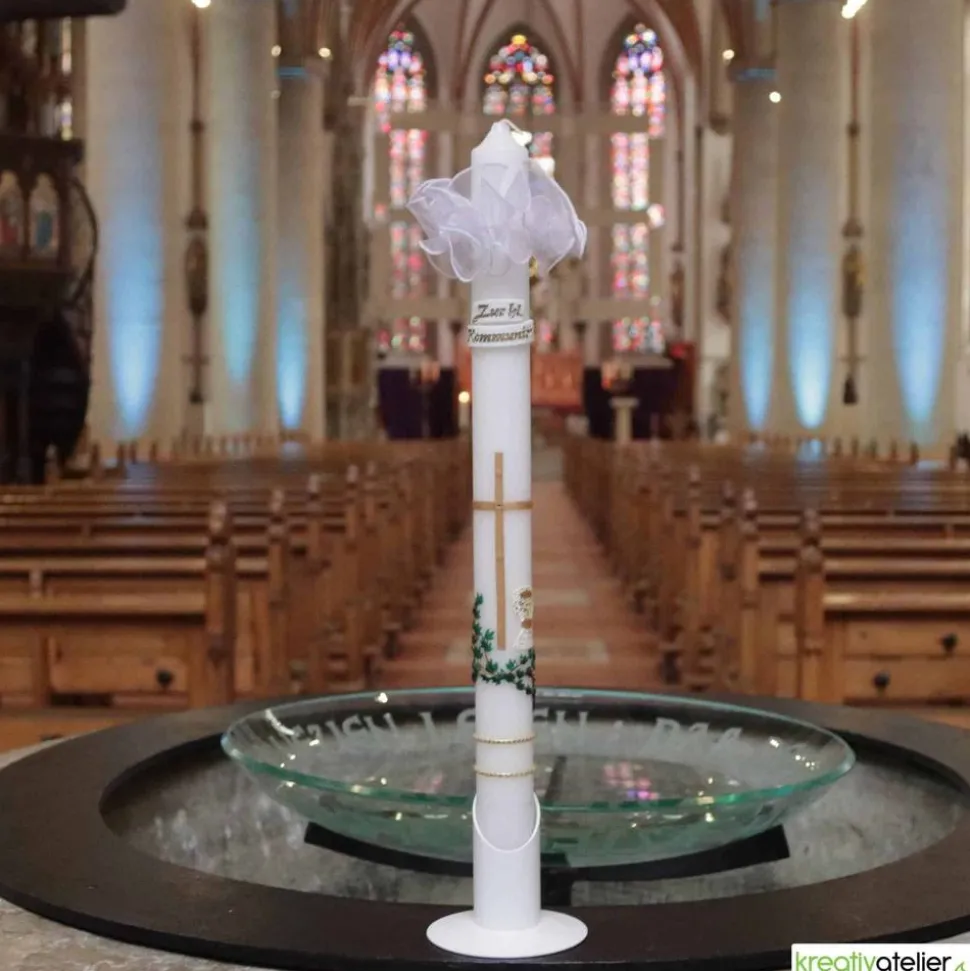 Diese Kommunionkerze wird in meinem Atelier individuell für Sie gefertigt. Als Rohling verwende ich ausschließlich Qualitätskerzen, die in Deutschland nach traditionellen Verfahren gezogen werden.
