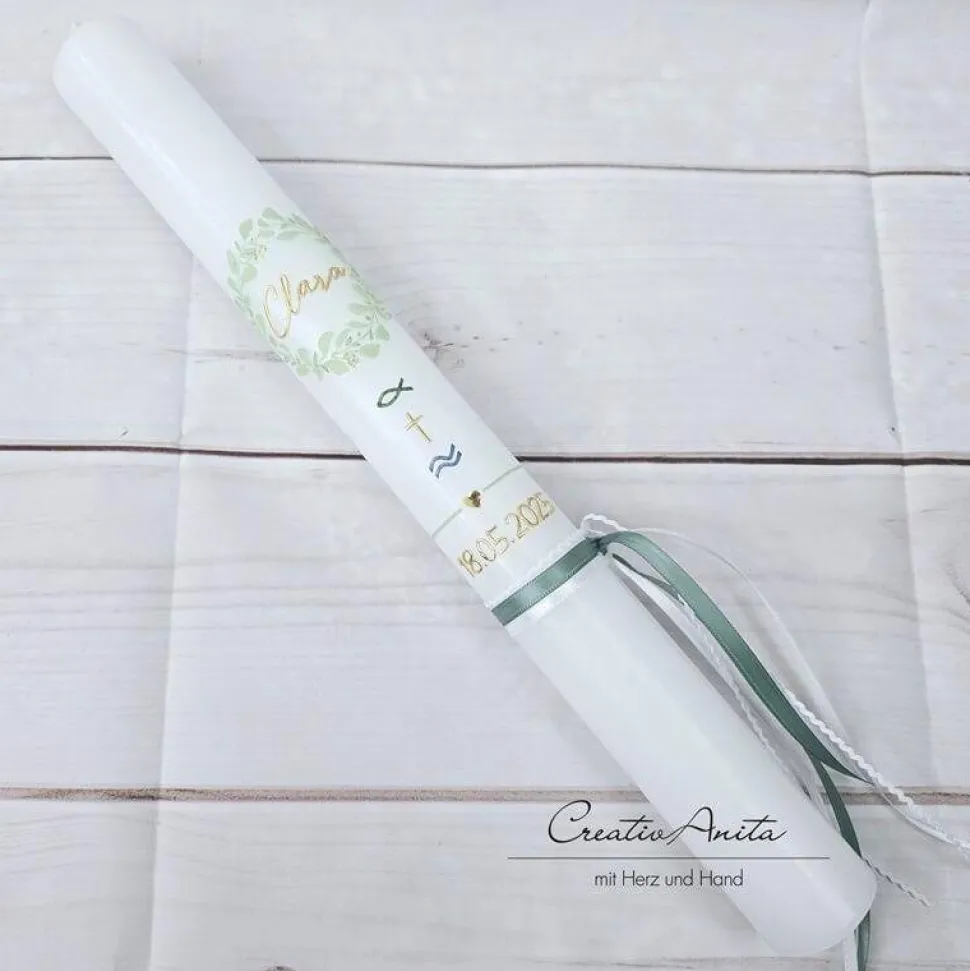 Das Design mittig ist ein Eukalyphtuskranz in den Farben gold und eukalyphtus gestaltet. Mittig im Kranz wird der Name dargestellt.