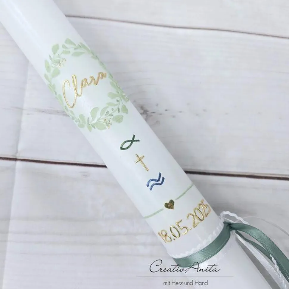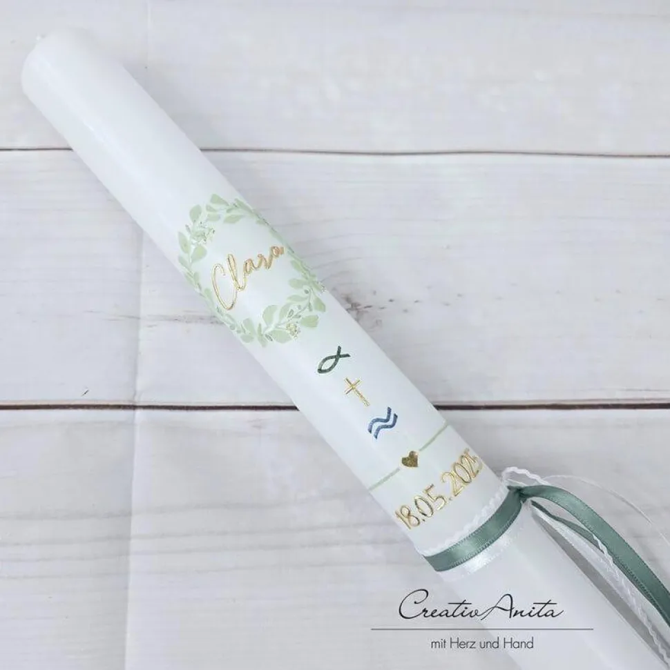 Darunter befinden sich christliche Symbole mit Fisch, Kreuz und Wasser in den Farben grün metallic, gold und blau metallic.