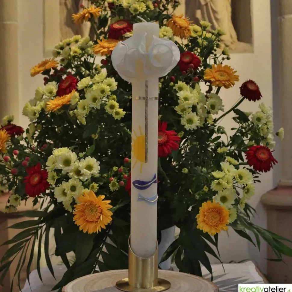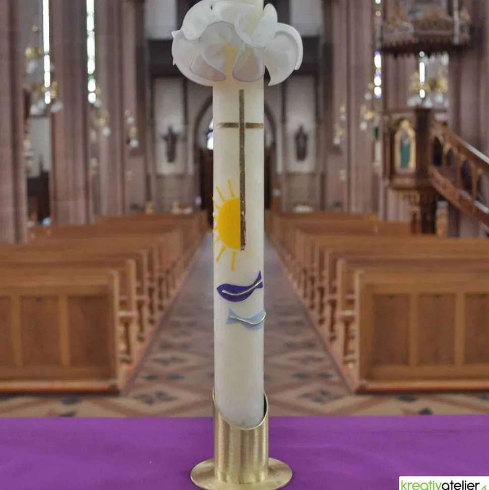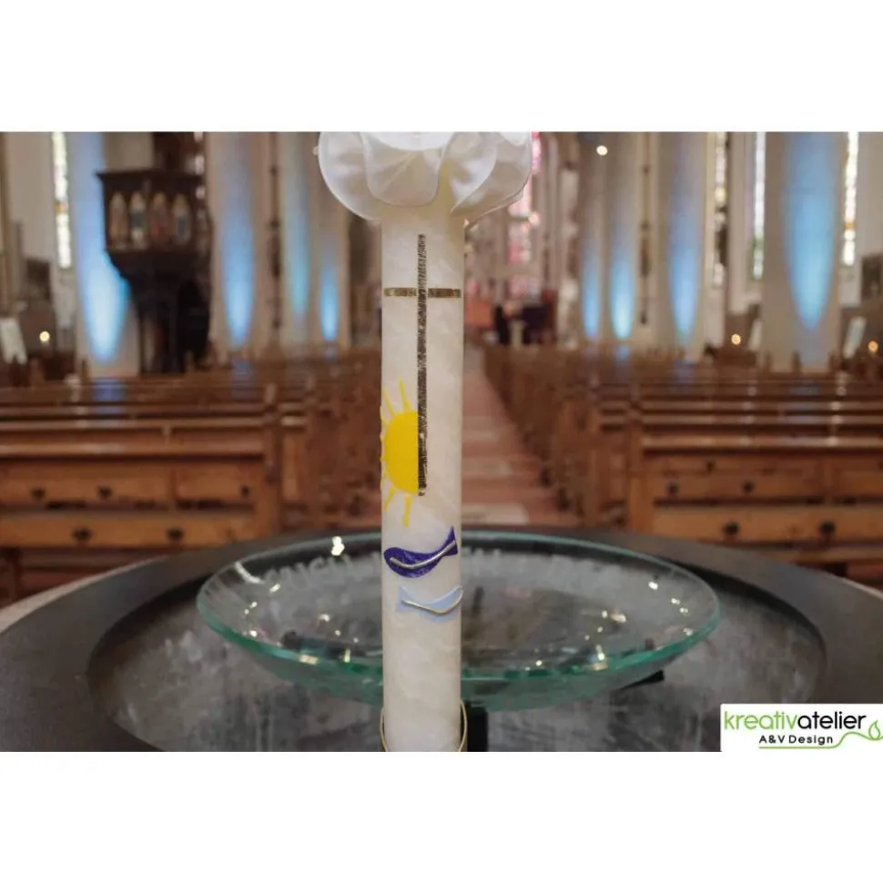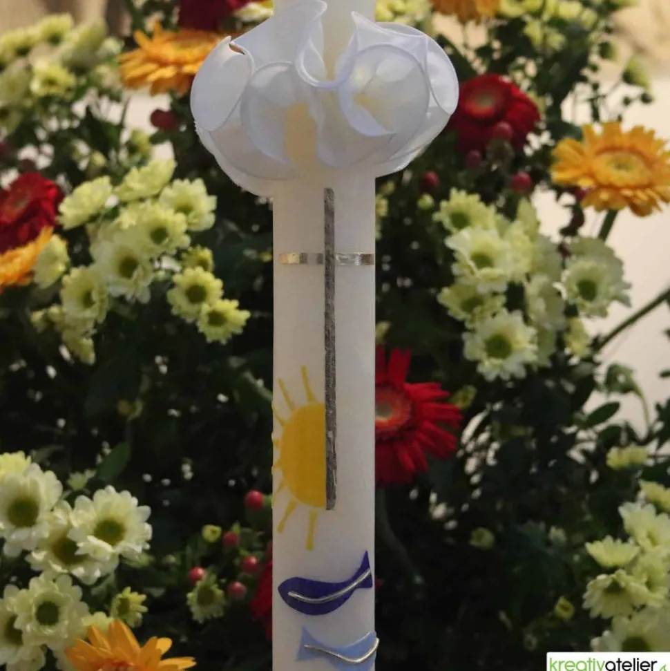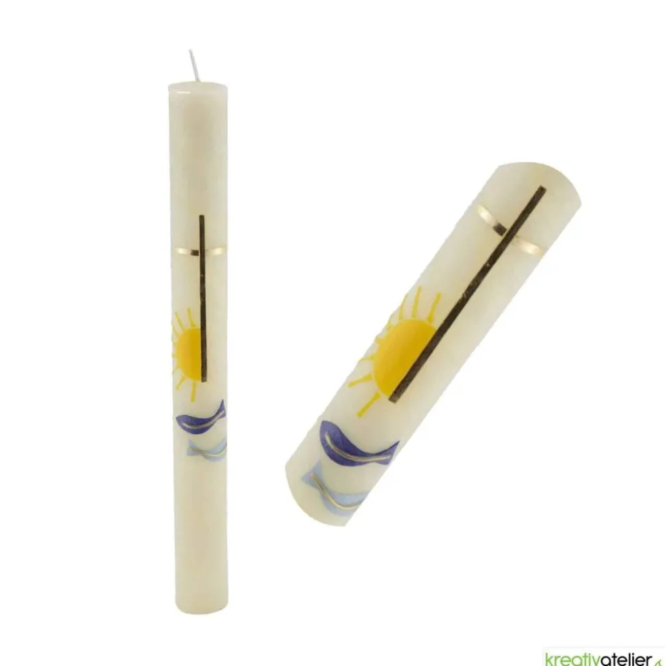 Die Kommunionkerze mit Kreuz, Sonne und Fischen ist ein Symbol für den Empfang der Kommunion und den Glauben an Jesus Christus. Das Kreuz aus edlem Gold steht für das Leiden und den Tod Jesu, während die Sonne aus kräftigem Gelb seine Auferstehung und sein strahlendes Licht symbolisiert und die Hoffnung auf ein ewiges Leben verkörpert. Die Fische im teilweise kräftigen Blau stehen als Symbol für die frühe Christenheit und die Verkündigung des Evangeliums und runden das Gesamtbild der Kommunionkerze wunderbar ab.