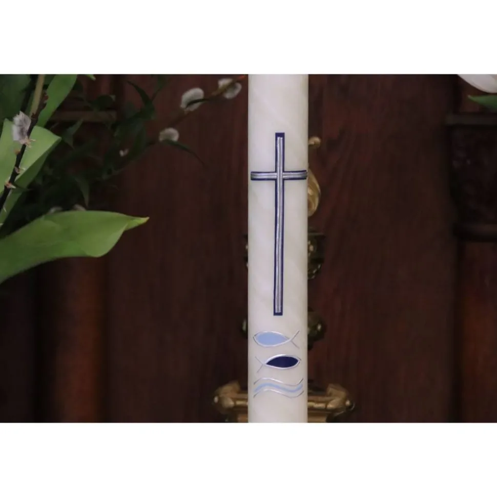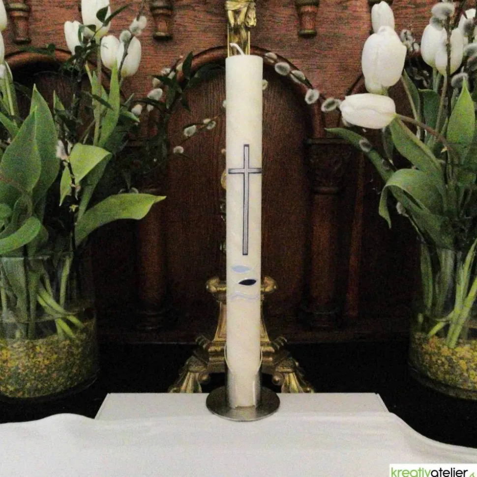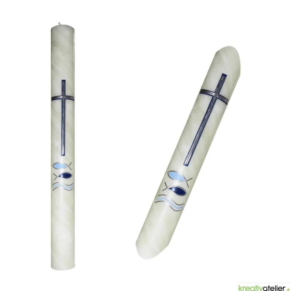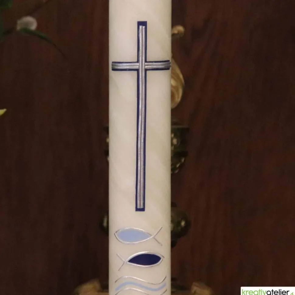 Diese Kommunionkerze aus handgeknetetem Bienenwachs mit blauem Kreuz, Fischen und Wellen ist ein Symbol für die Kommunion und den Glauben an Jesus Christus. Das blaue Kreuz steht für das Leiden und den Tod Jesu, die Fische für die frühe Christenheit und die Verkündigung des Evangeliums und die Wellen für das Meer, das die Welt und die Menschen symbolisiert.