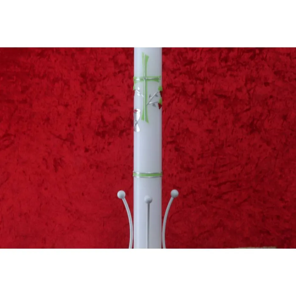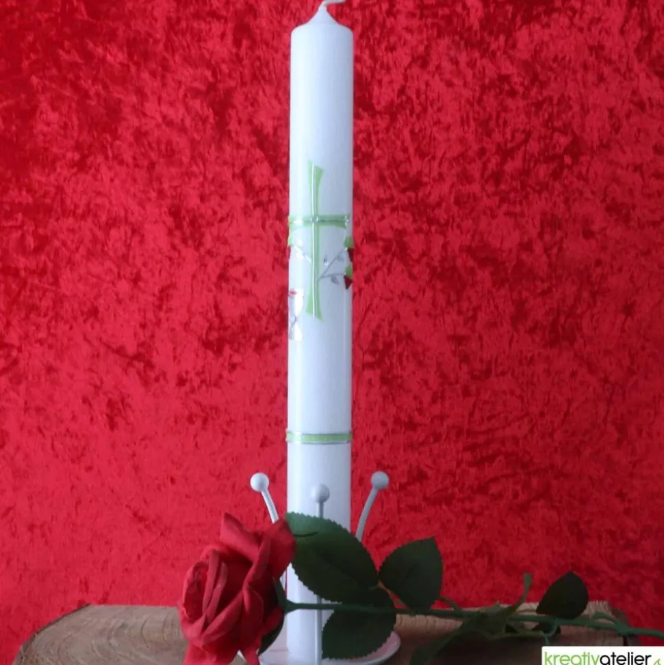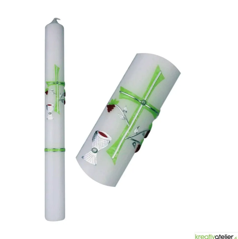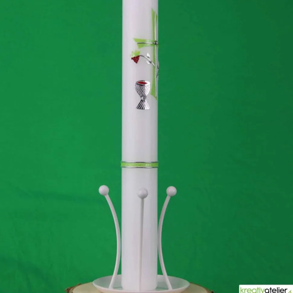 Liebevoll von Hand verzierte, aufwändige Taufkerze mit hellgrünem Byzantiner-Kreuz, silbernem Kelch und einer kleinen Weinrebe. Die Liebe zum Detail wird bei den kleinen, roten Trauben deutlich. Diese bestehen aus feinen Wachskügelchen, die sich sehr schön von der Kerze abheben. Oberhalb des schmalen Bandes kann die Kommunionkerze mit Namen und Daten personalisiert werden.
