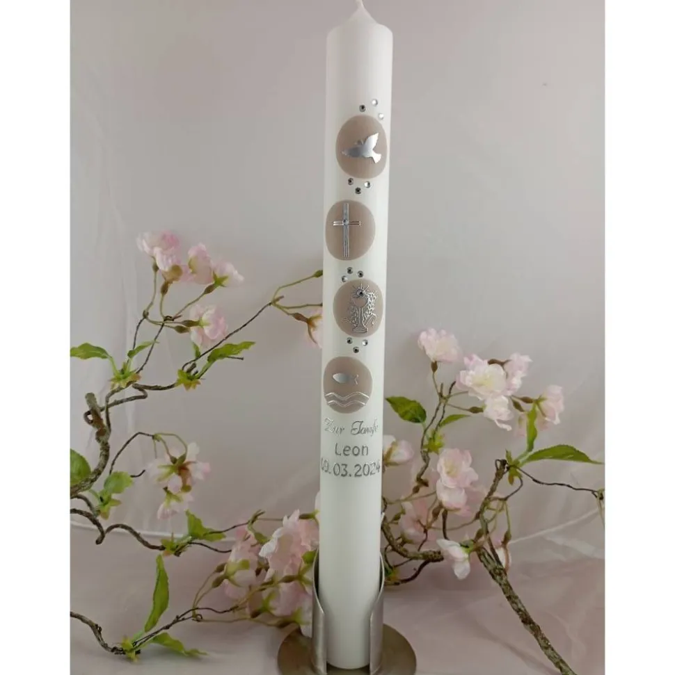 Kommunionkerze Taufkerze lang christliche Symbole Mädchen Jungen Name Datum individualisierbar 400/40 mm