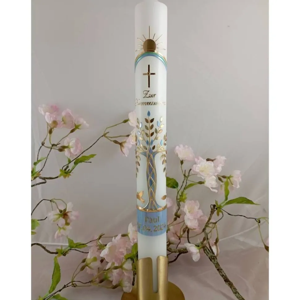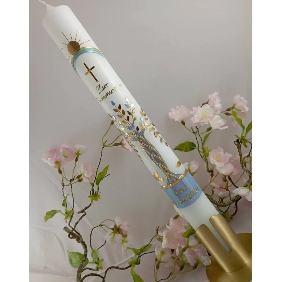 Kommunionkerze Taufkerze lang Lebensbaum Baum Regenbogen Sonne Fische Jungen Name Datum individualisierbar 400/40 mm