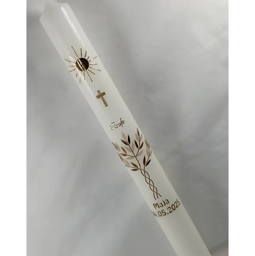 Kommunionkerze Taufkerze lang Lebensbaum gold Jungen Mädchen Wachsverziert 40×4 cm TKR1525