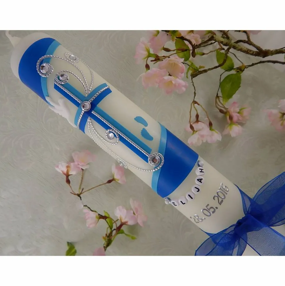 Kommunionkerze Taufkerze lang Mädchen Jungen blau silber Kreuz Taube Schleife Name Datum individualisierbar 300/50 mm oder 400/40 mm