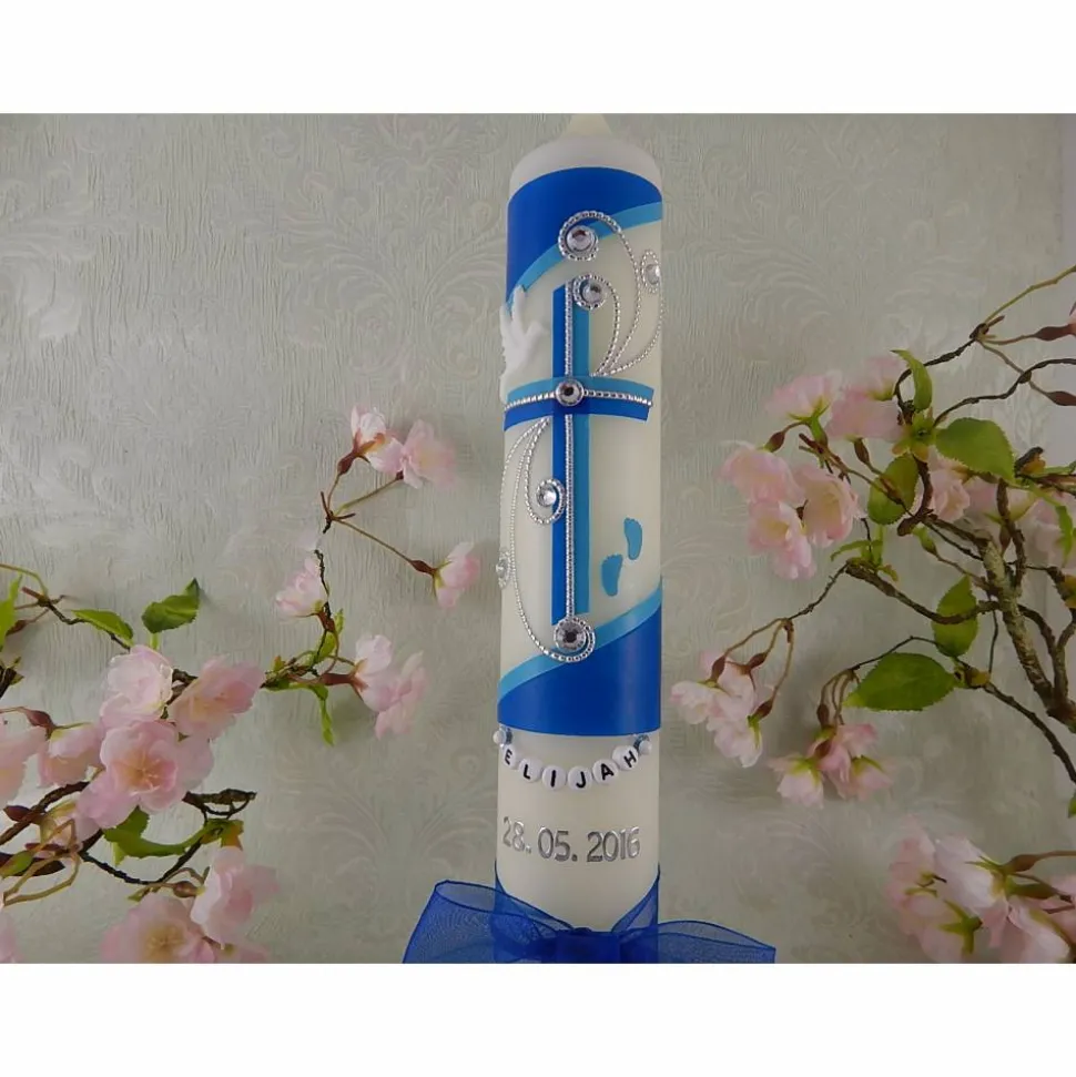 Kommunionkerze Taufkerze lang Mädchen Jungen blau silber Kreuz Taube Schleife Name Datum individualisierbar 300/50 mm oder 400/40 mm Original Design TKR166