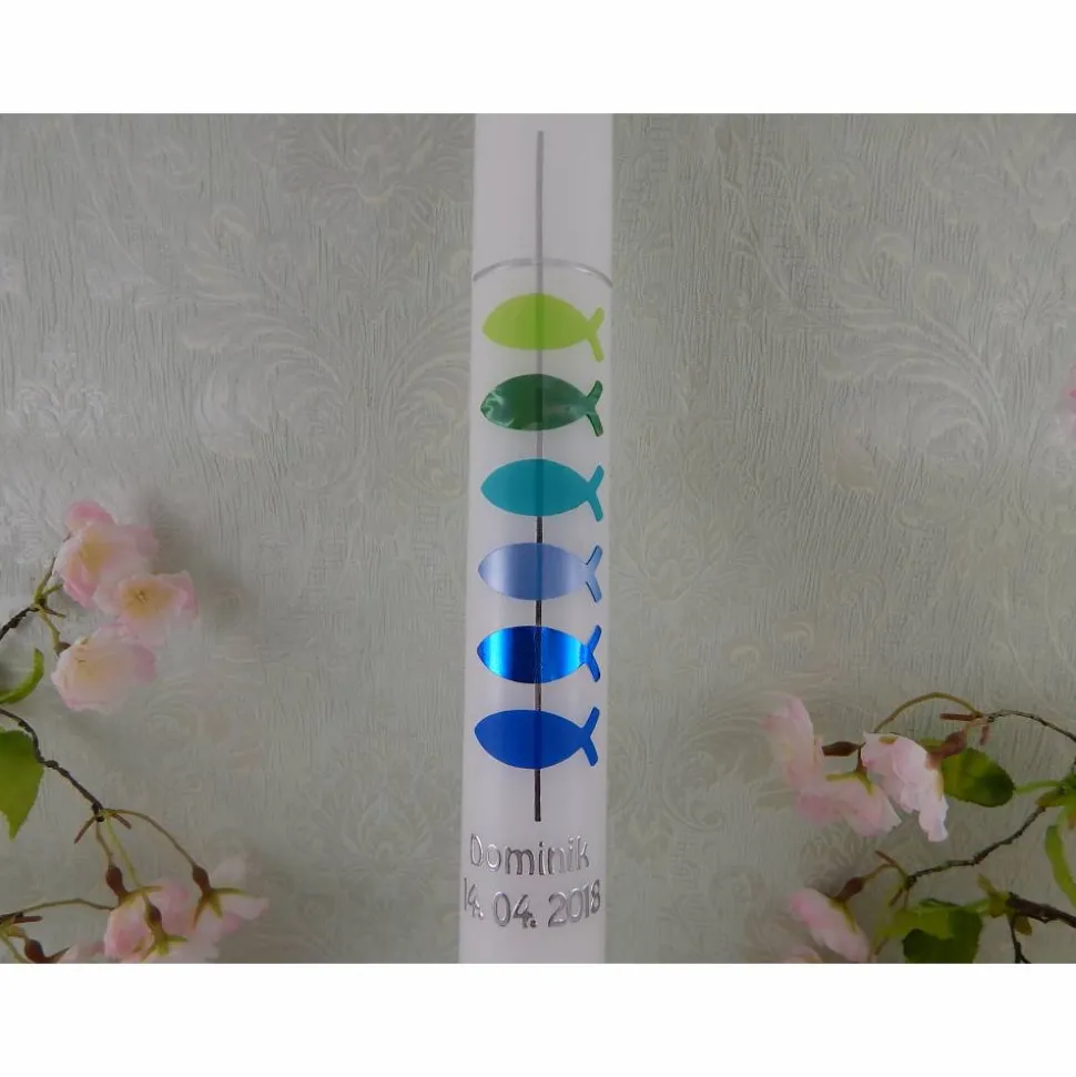 Kommunionkerze Taufkerze lang Mädchen Jungen bunt silber Kreuz Fische Name Datum individualisierbar