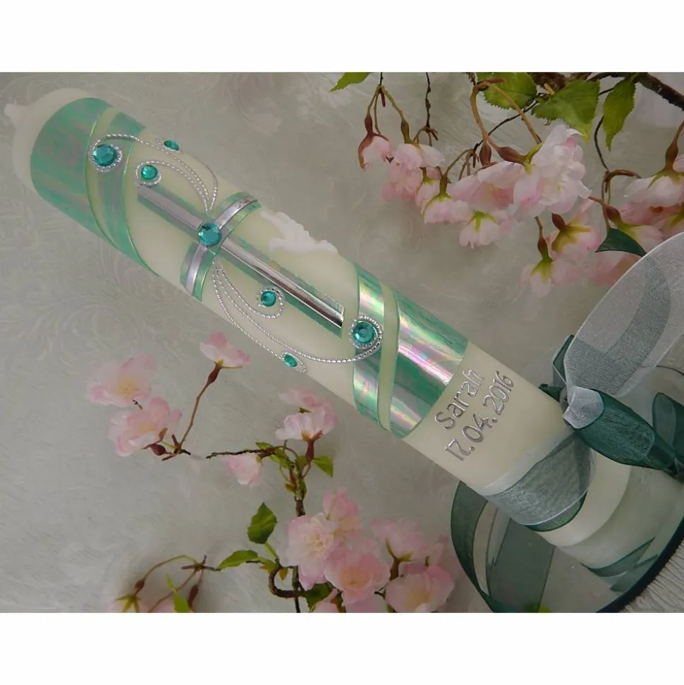 Kommunionkerze Taufkerze lang Mädchen Jungen grün irisierend silber Kreuz Taube Schleife Name Datum individualisierbar 300/50 mm oder 400/40 mm