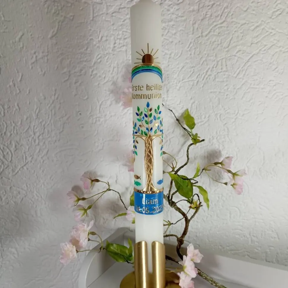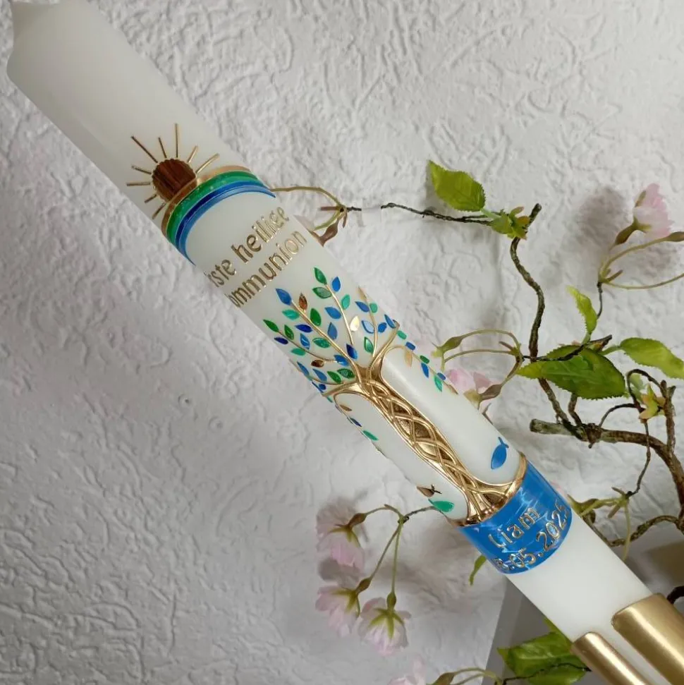 Kommunionkerze Taufkerze Lebensbaum blau grün gold Original Design KKR0234