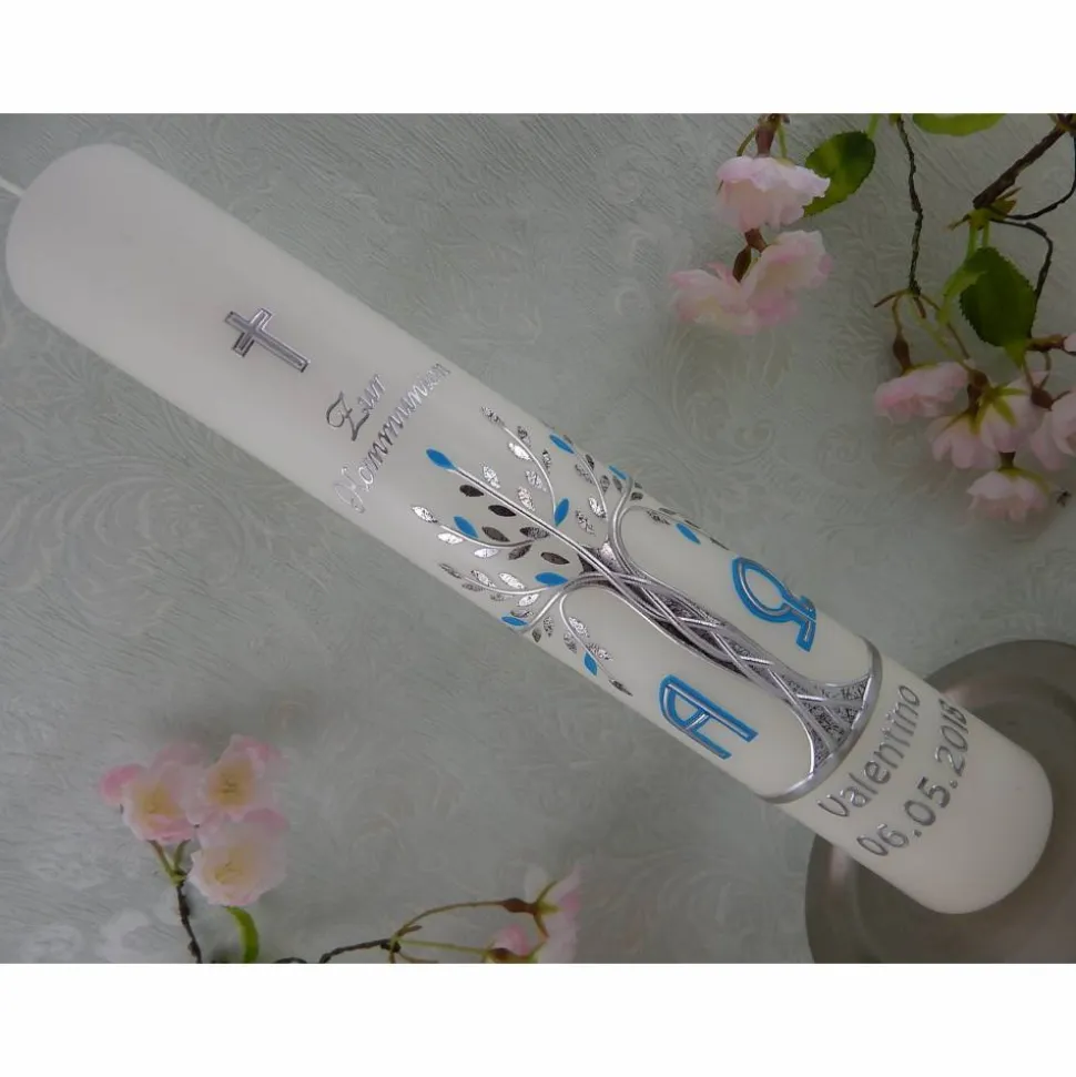 Kommunionkerze Taufkerze lang Mädchen Jungen Lebensbaum blau silber Baum des Lebens Kreuz Alfa Omega Name Datum individualisierbar 300/50 mm