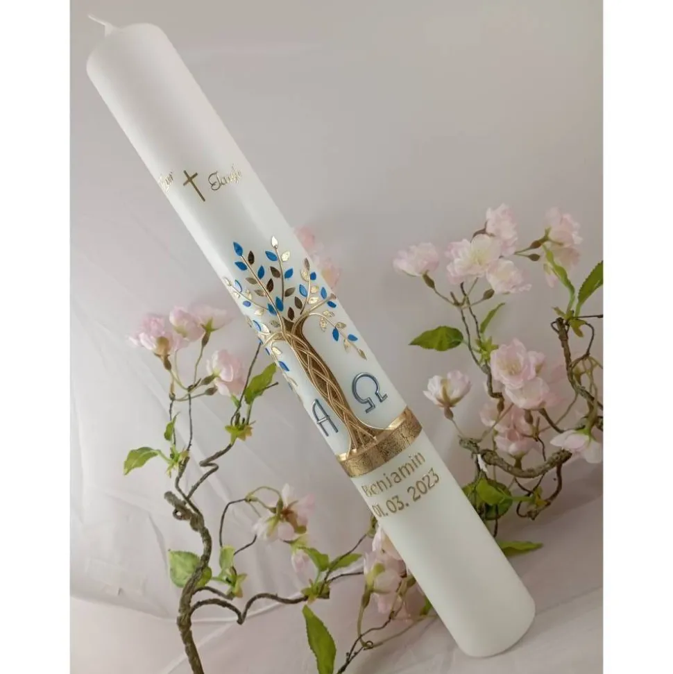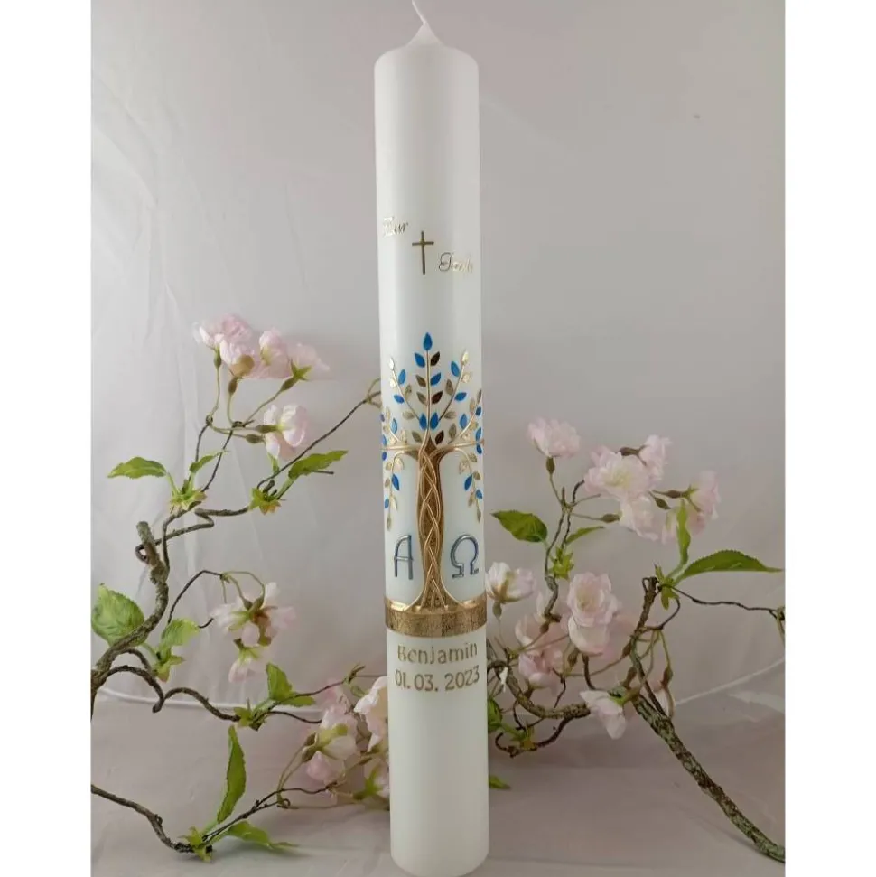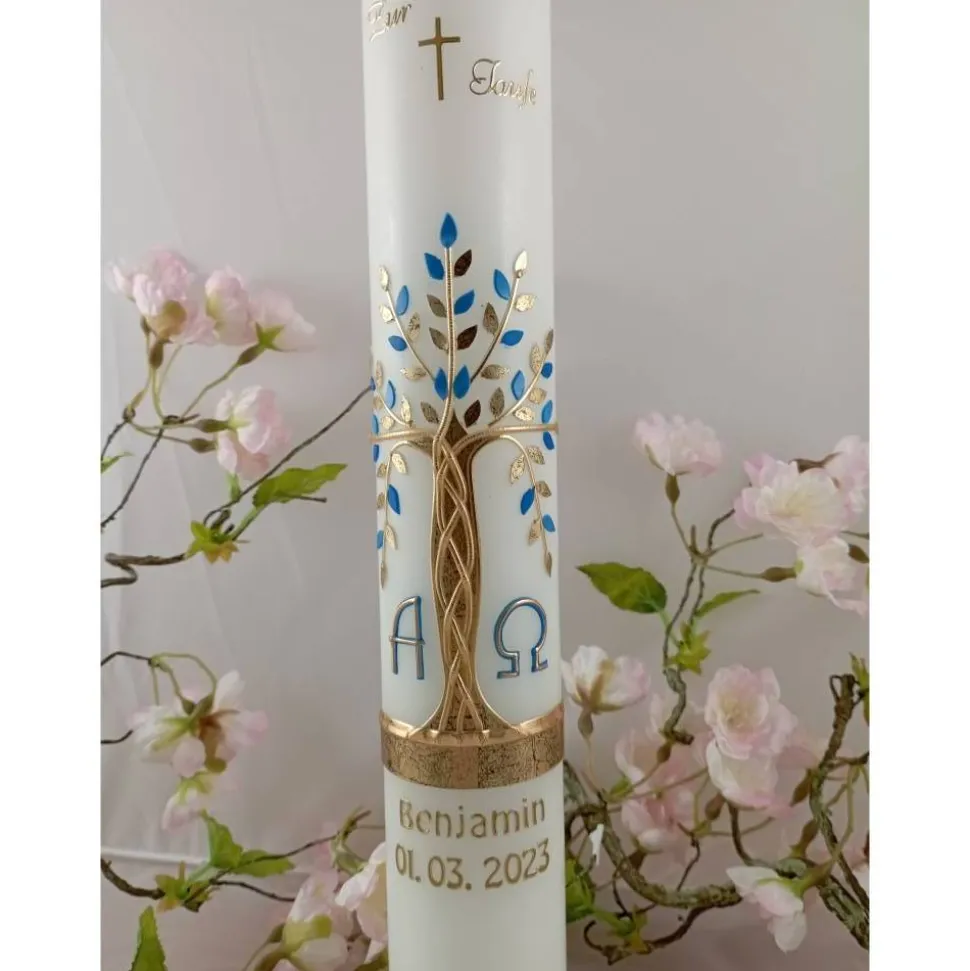 Kommunionkerze Taufkerze lang Mädchen Jungen Lebensbaum gold blau Baum des Lebens Kreuz Alfa Omega Name Datum individualisierbar