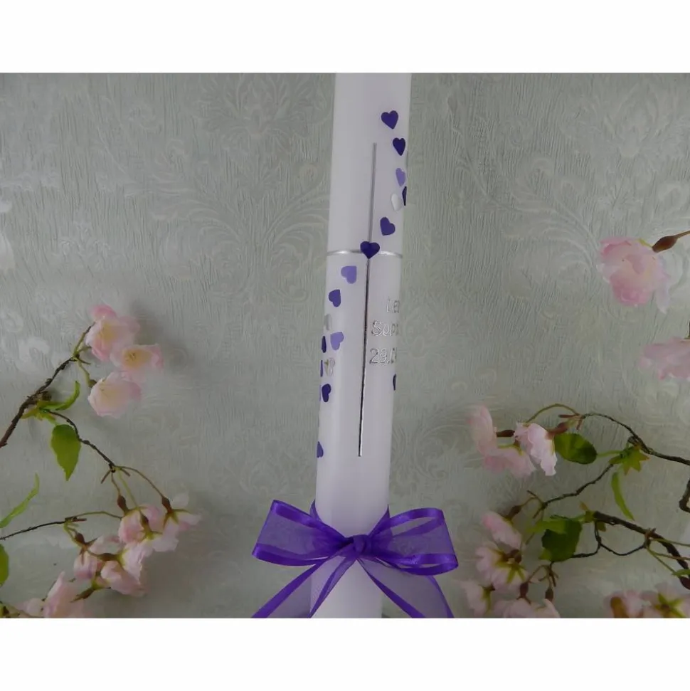 Kommunionkerze Taufkerze lang Mädchen Jungen lila silber Herzen Name Datum individualisierbar