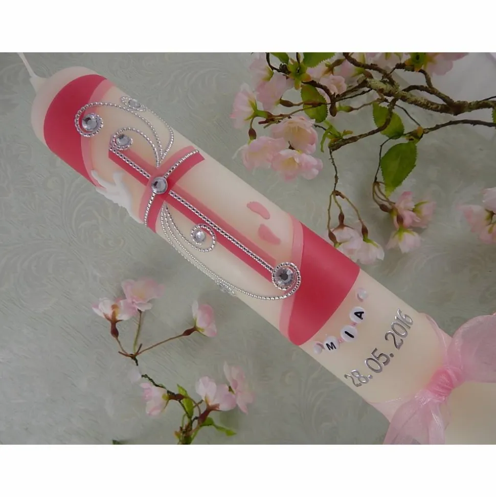 Kommunionkerze Taufkerze lang Mädchen Jungen pink silber Kreuz Taube Schleife Name Datum individualisierbar 300/50 mm oder 400/40 mm