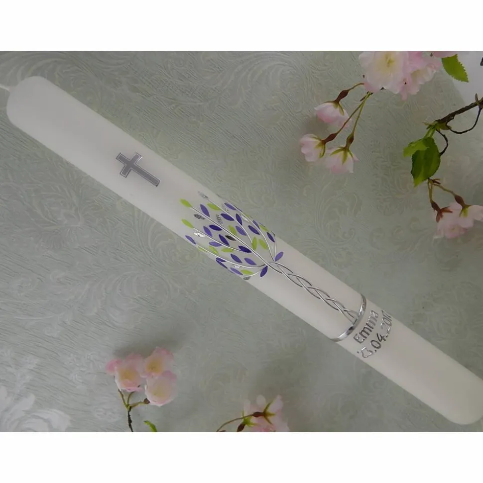 Kommunionkerze Taufkerze lang Mädchen Lebensbaum flieder grün silber Baum des Lebens Kreuz Name Datum individualisierbar