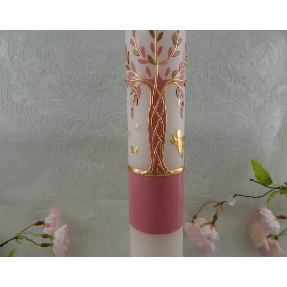 Kommunionkerze Taufkerze lang Mädchen Lebensbaum rosa gold Baum des Lebens Kreuz Regenbogen Name Datum individualisierbar 400/50 mm