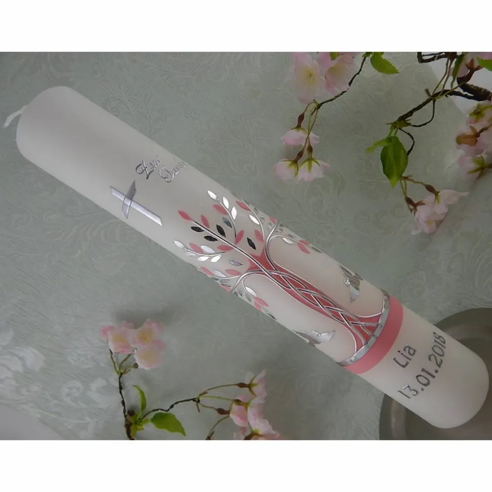 Kommunionkerze Taufkerze lang Mädchen Lebensbaum rosa silber Baum des Lebens Kreuz Sterne Name Datum individualisierbar