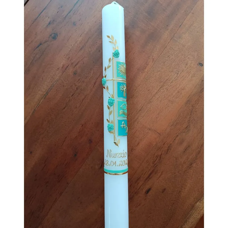 Die Verzierung auf der Kerze wird in liebevoller Handarbeit für Sie erstellt.