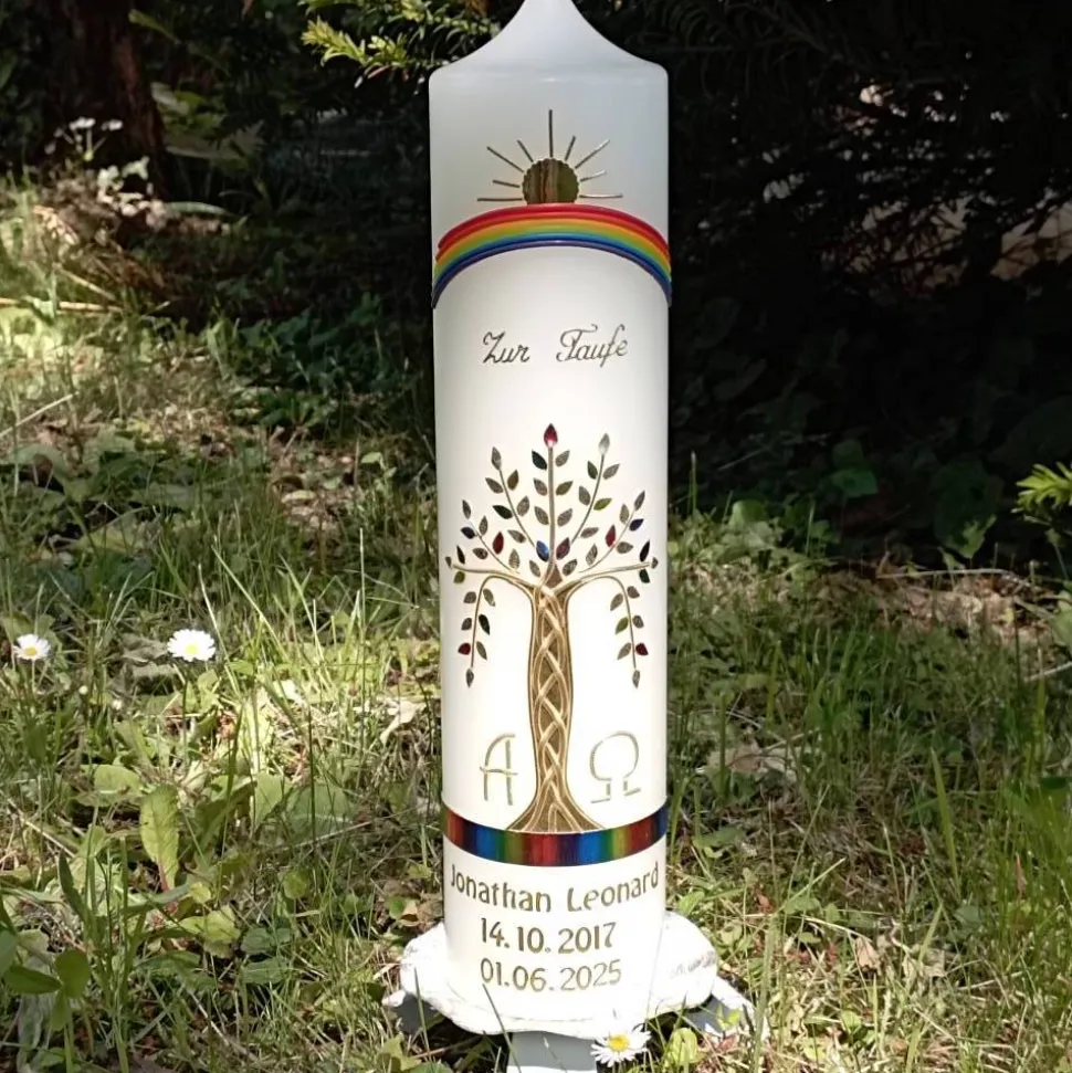 Kommunionkerze Taufkerze Mädchen Jungen Lebensbaum bunt gold Baum des Lebens Name Datum Spruch individualisierbar 30×7