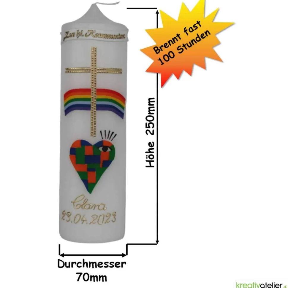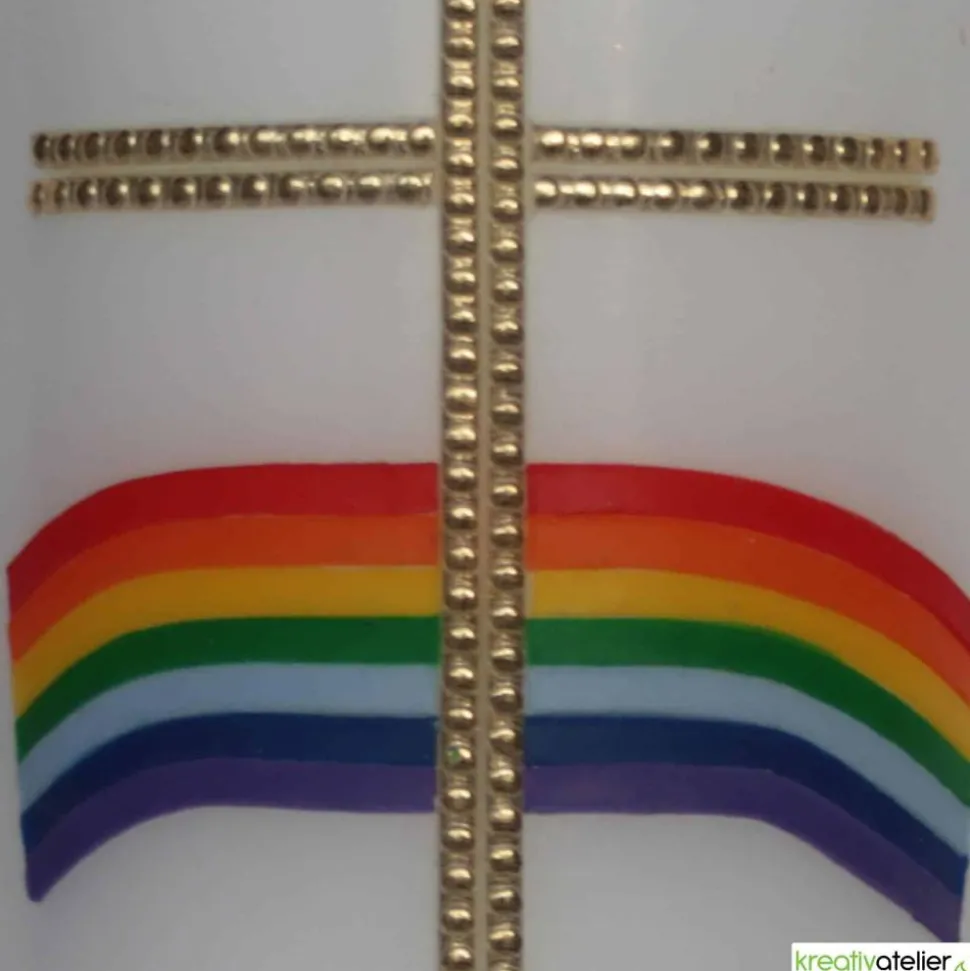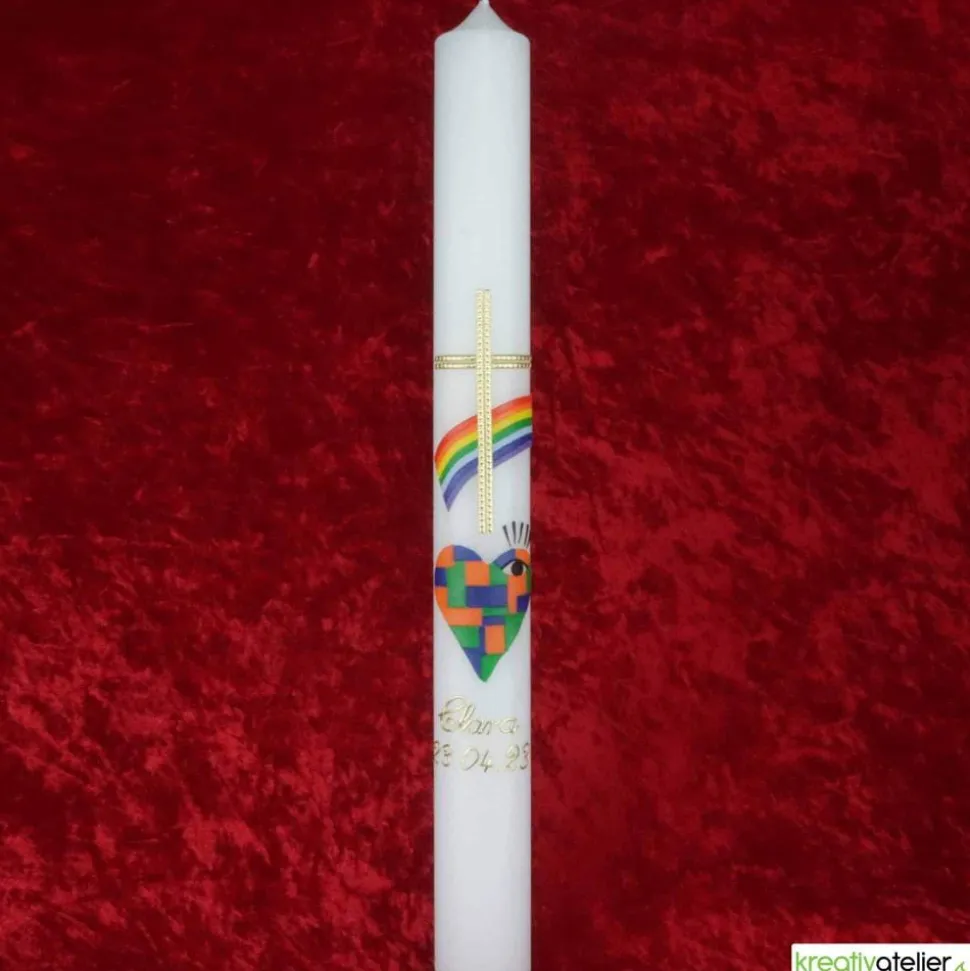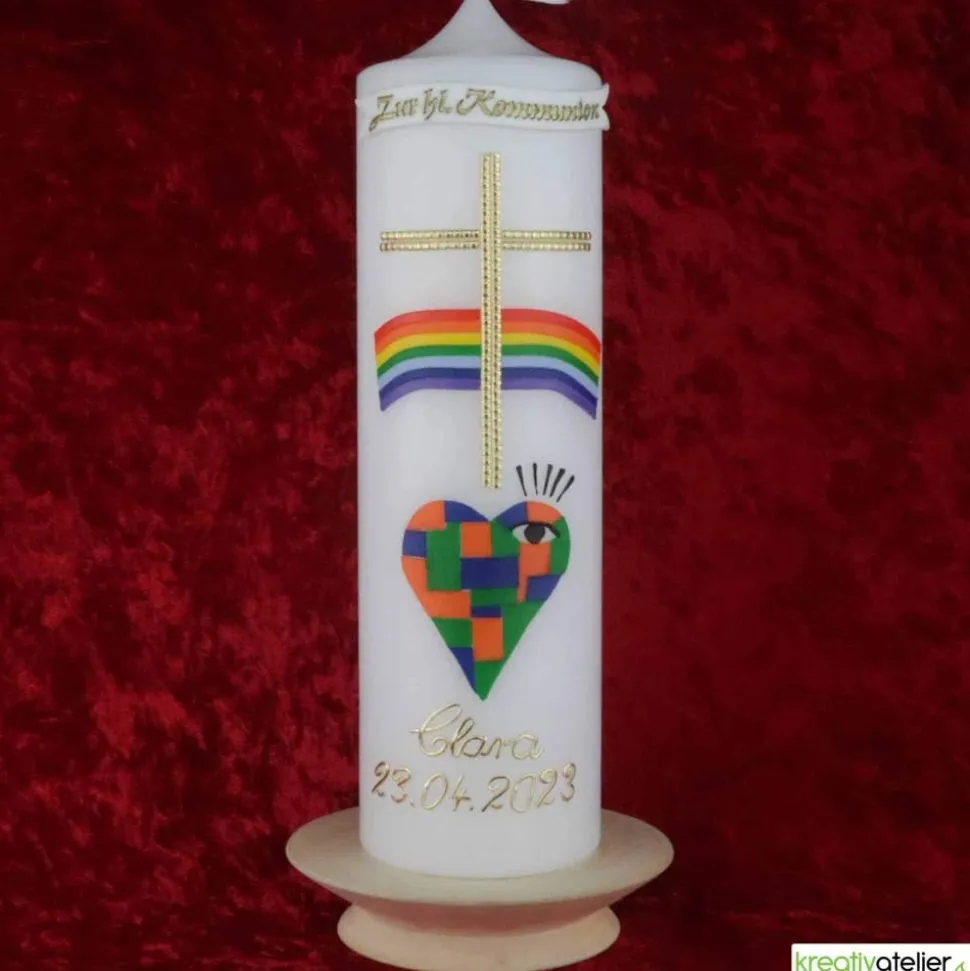 Auf der Kerze ist ein goldenes Kreuz abgebildet, über dem ein bunter Regenbogen erstrahlt. Das Herz darunter ist mit liebevoll angeordneten Echtwachskacheln gefüllt, die durch ihre dreidimensionale Optik einen beeindruckenden plastischen Effekt erzeugen. In der oberen rechten Ecke des Herzens befindet sich ein sehendes Auge, umgeben von Lichtstrahlen, die die wiedererlangte Sehkraft von Bartimäus symbolisieren.