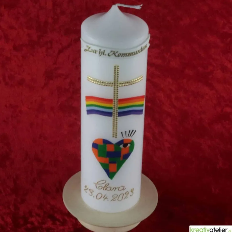 Jede Kommunionkerze wird in meinem Atelier individuell für Sie angefertigt und basiert auf einem hochwertigen RAL-zertifizierten Rohling, der in Deutschland nach traditionellen Verfahren hergestellt wird.