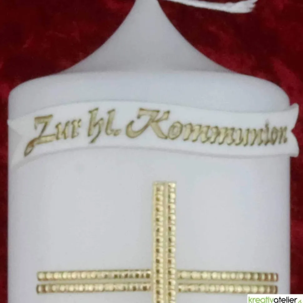 Der Schriftzug „zur hl. Kommunion“ oberhalb des Kreuzes mit goldenen Buchstaben auf einem erhabenen Wachsband ist ein fester Bestandteil der Kerze.