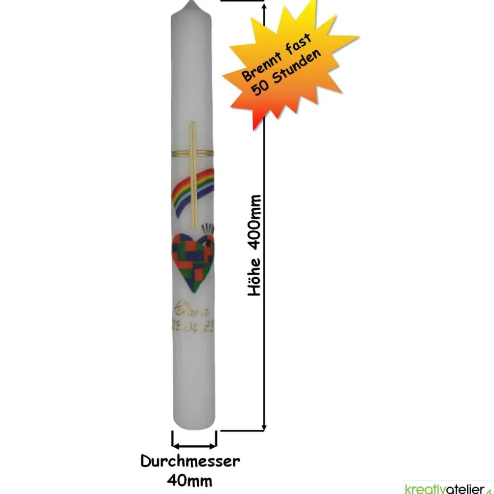 Die Beschriftung erfolgt mit echten Wachsbuchstaben in goldener Schreibschrift wie auf dem Bild abgebildet unterhalb des Herzens. Die Kommunionkerze wird unterhalb des Herzens mit einem Vornamen und dem Kommunionsdatum beshriftet. Die Beschriftung ist im Preis enthalten.