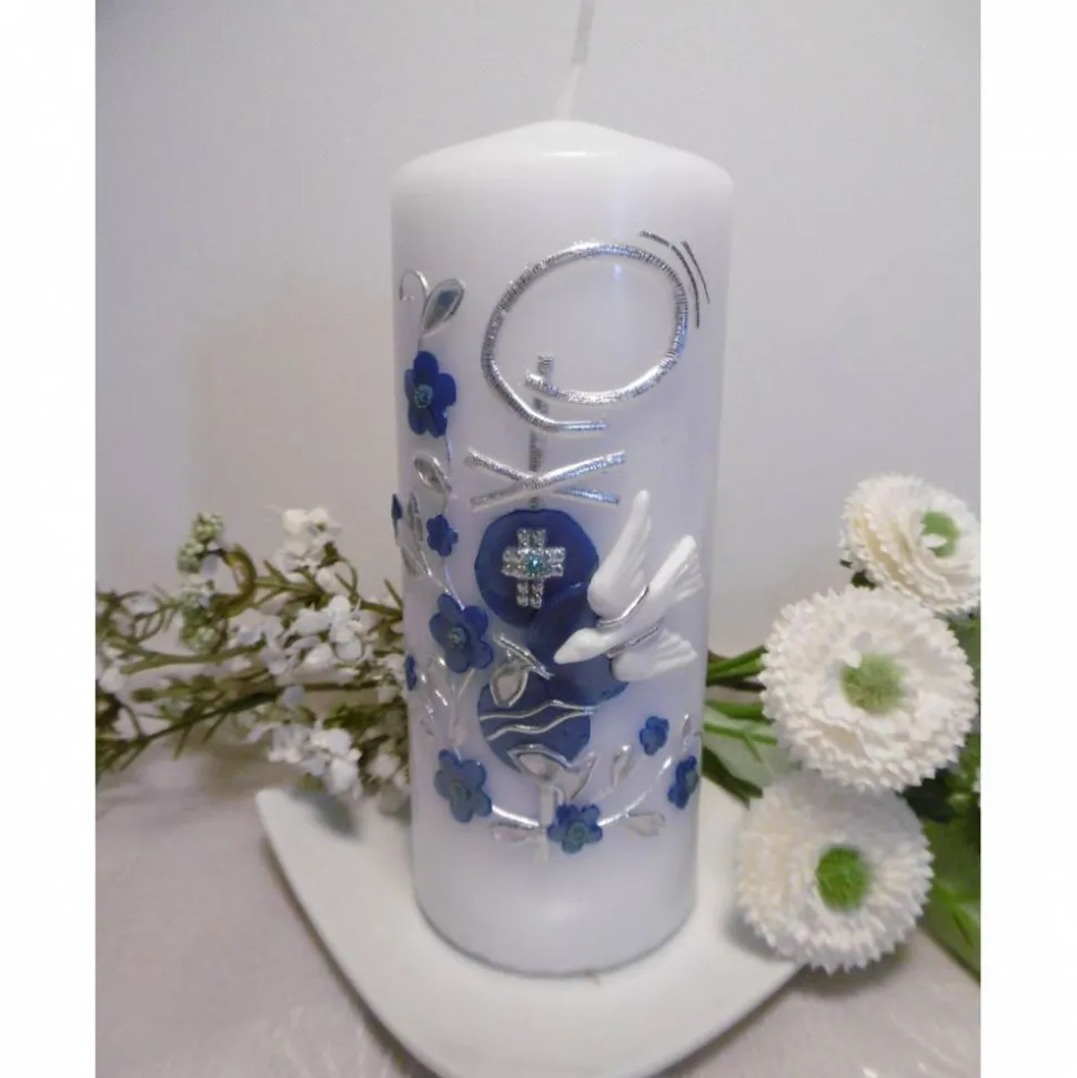 Bei der angebotenen Kerze handelt es sich um eine Kommunionskerze mit dem sogenannten Petrus-Kreuz, welches wir mit weiteren christlichen Symbolen und einer farblich passenden Blütenranke verziert haben.