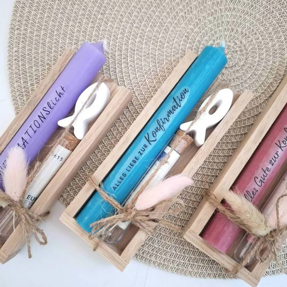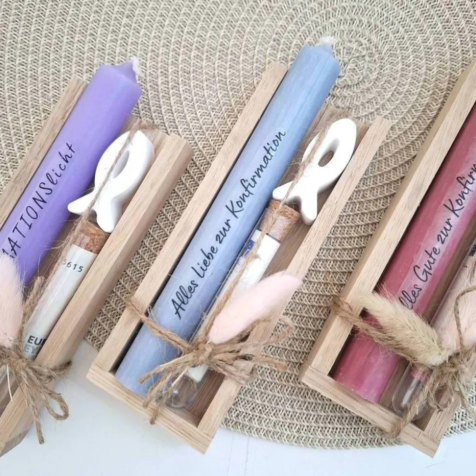 Das Set besteht aus einer Kerze (in der Farbe deiner Wahl) mit einer Aufschrift deiner Wahl und einem kleinen symbolischem Fisch in einer Holzbox, ergänzt wird das Set mit einem Reagenzglas worin man dem Konfirmationskind Geld, Gutscheine oder Ähnlichem übergeben kann.
