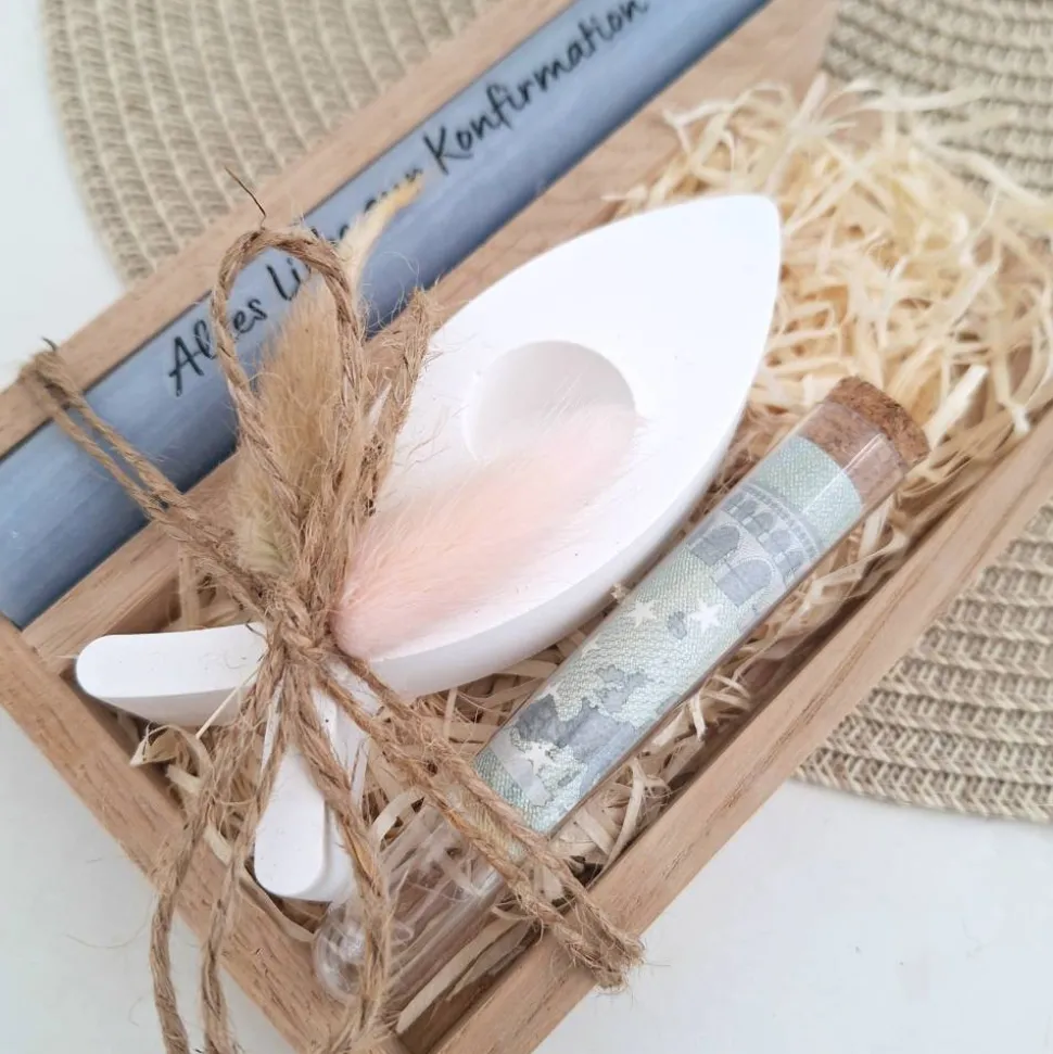 Das Set wird in einem Holzrahmen mit Trockenblumen zusammengebunden und kann so direkt verschenkt werden.