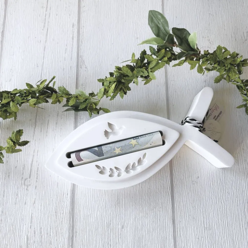 Dieses schöne Geschenkset beinhaltet einen Fisch (14,5×6,6x2cm) als christliches Symbol mit einer passenden Karte (15x15cm). Hier kannst Du einen Gutschein oder Geldschein schön verschenken. Zum Lieferumfang gehört noch eine einfache Karte (keine Klappkarte) mit der passenden Aufschrift dazu. Auf der Rückseite könnt Ihr einen entsprechenden Gruß an die Beschenkten hinterlassen.