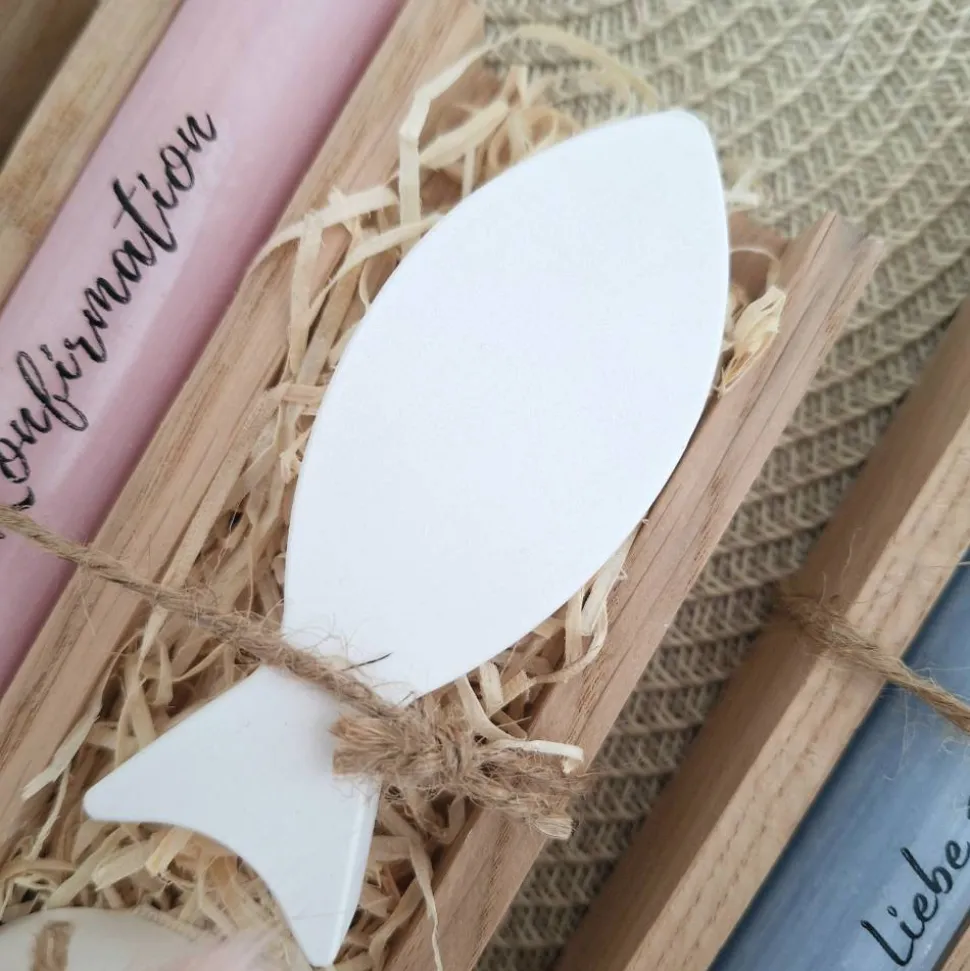 Das Set besteht aus einer Kerze (in der Farbe deiner Wahl) mit einer Aufschrift deiner Wahl, einem Fisch (Var. 2) und einem Kerzenhalter in runder Form.