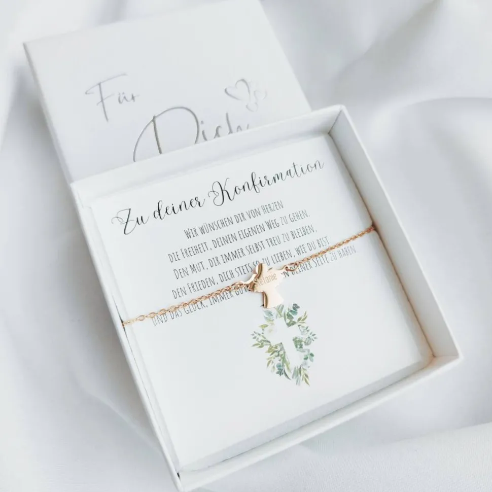 Diese einzigartige Engel Armband aus Edelstahl wird jedem Mädchen und Jungen ein strahlendes Lächeln auf die Lippen zaubern. Die Kombination aus dem personalisierten Schutzengel Armband, der bedruckten Konfirmation Karte und der edlen „Für Dich“ Geschenkbox machen das Armband zu einem sehr persönlichen Konfirmationsgeschenk.