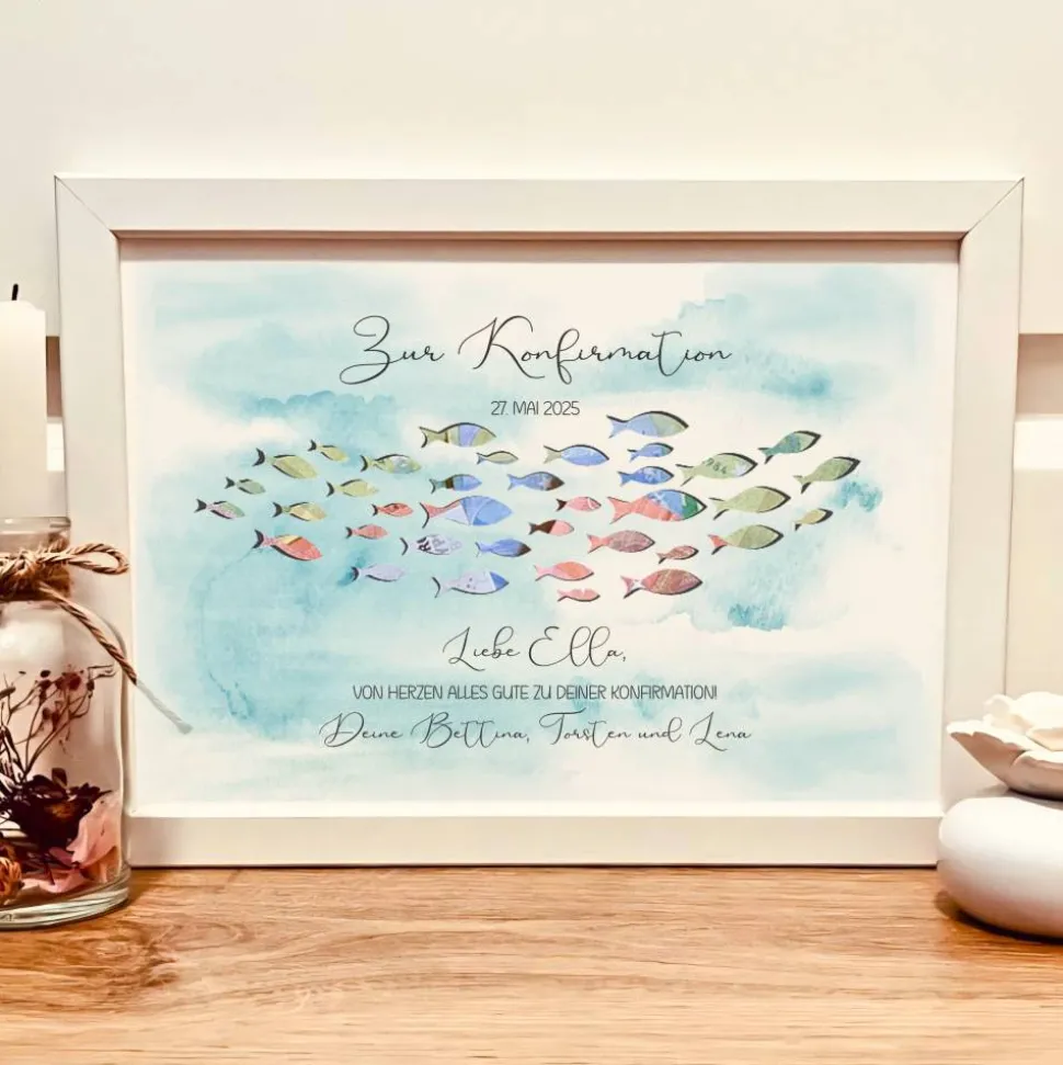 Das kreative Schnittbild der Fische bietet eine stilvolle Möglichkeit, Geldgeschenke ansprechend zu verpacken und zu verschenken. Die Geschenkverpackung wird mit dem Namen des Konfirmanden, dem Konfirmationsdatum und den Namen der Gratulanten personalisiert – ideal für Eltern, Großeltern oder Paten.
