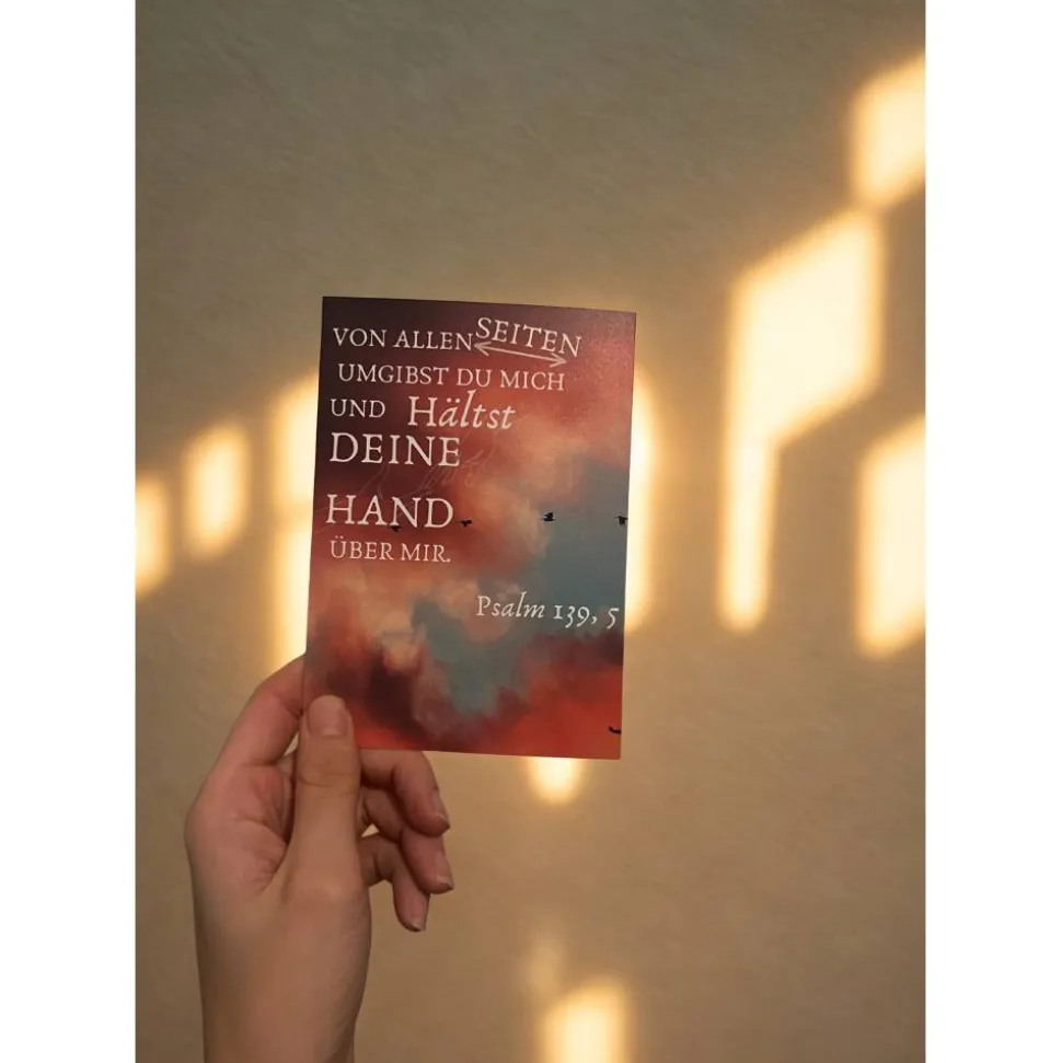 • Rückseite: Der zentrale Vers aus Psalm 139,5 („Von allen Seiten umgibst du mich…“) wird durch die Symbolik der frei fliegenden Vögel und der Hände die sich berühren, unterstrichen.